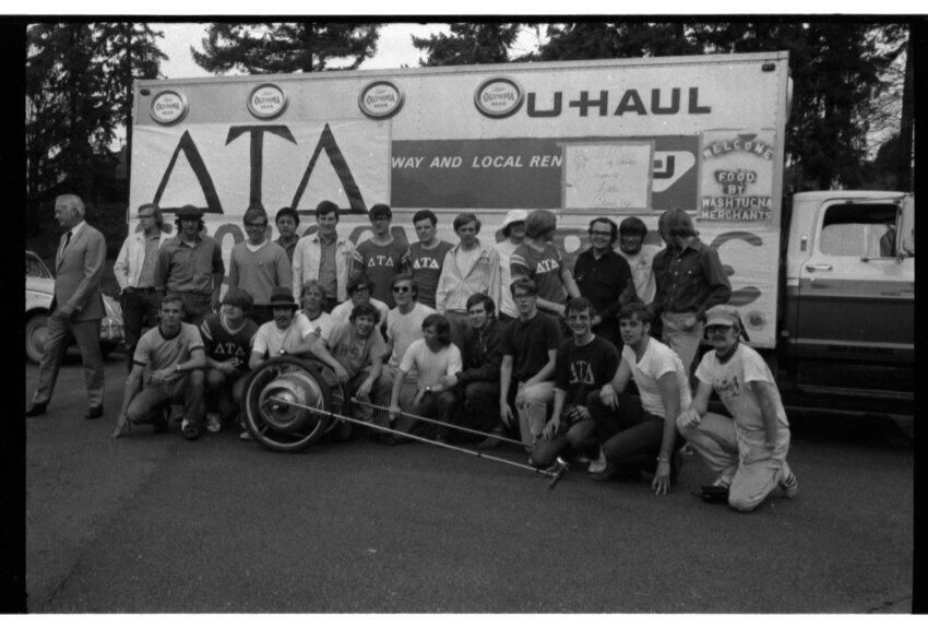 Negative, sheet film. 1 x 1.5 b&w. WSU Delta Tau Delta group brings truck to Olympia brewery to promote recycling. No ID on people. Group rolling beer keg.