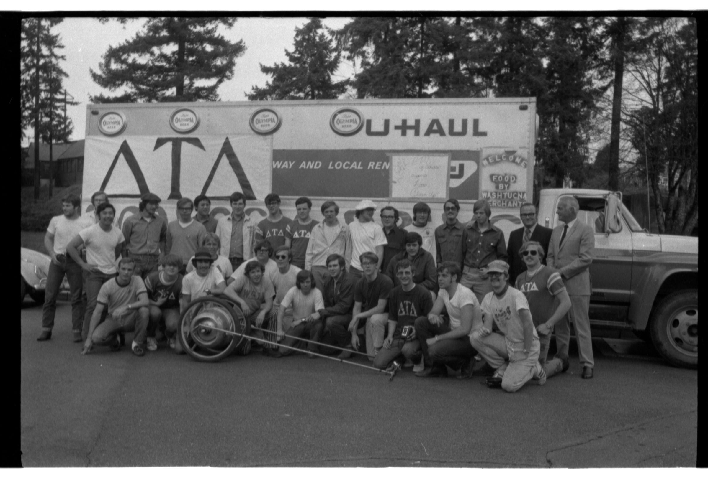 Negative, sheet film. 1 x 1.5 b&w. WSU Delta Tau Delta group brings truck to Olympia brewery to promote recycling. No ID on people. Group rolling beer keg.
