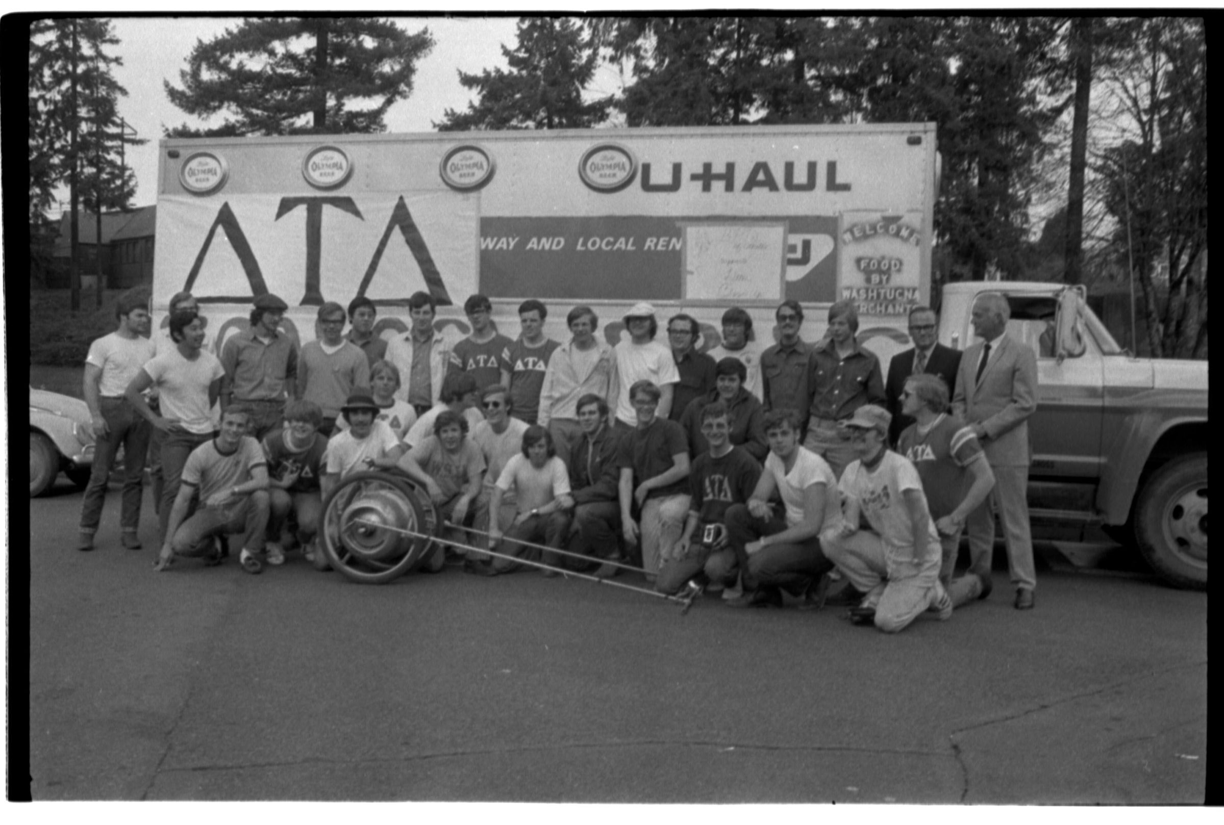 Negative, sheet film. 1 x 1.5 b&w. WSU Delta Tau Delta group brings truck to Olympia brewery to promote recycling. No ID on people. Group rolling beer keg.