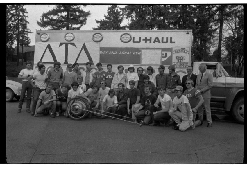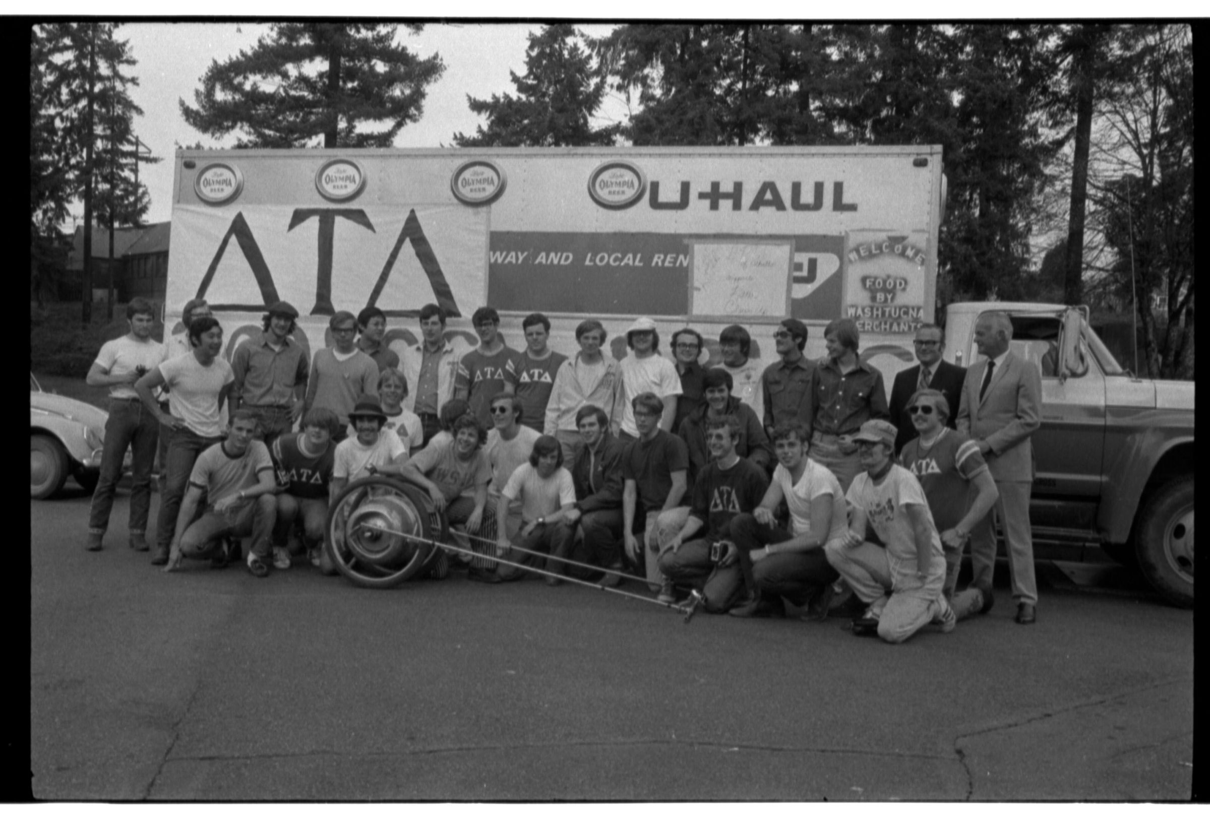 Negative, sheet film. 1 x 1.5 b&w. WSU Delta Tau Delta group brings truck to Olympia brewery to promote recycling. No ID on people. Group rolling beer keg.