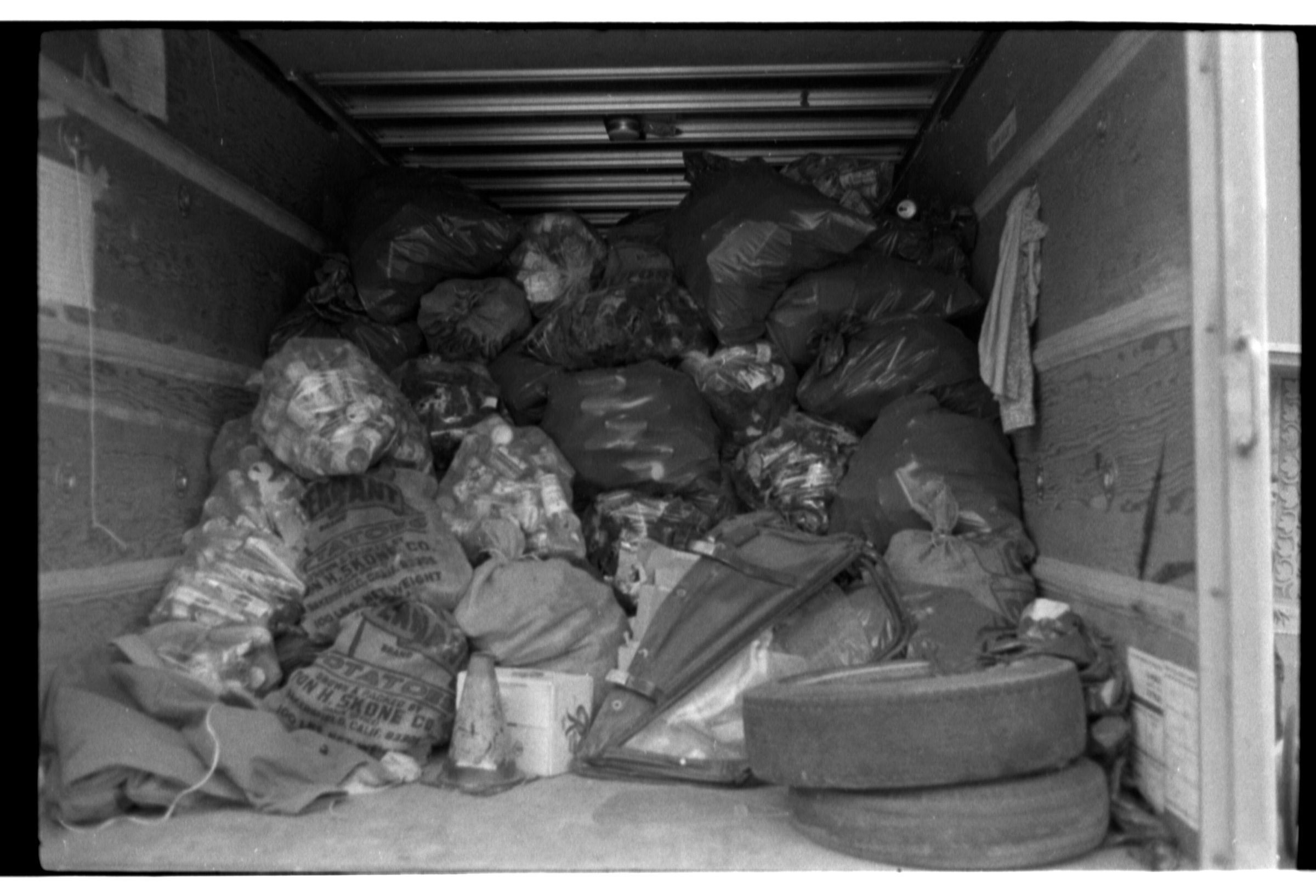 Negative, sheet film. 1 x 1.5 b&w. WSU Delta Tau Delta group brings truck to Olympia brewery to promote recycling.