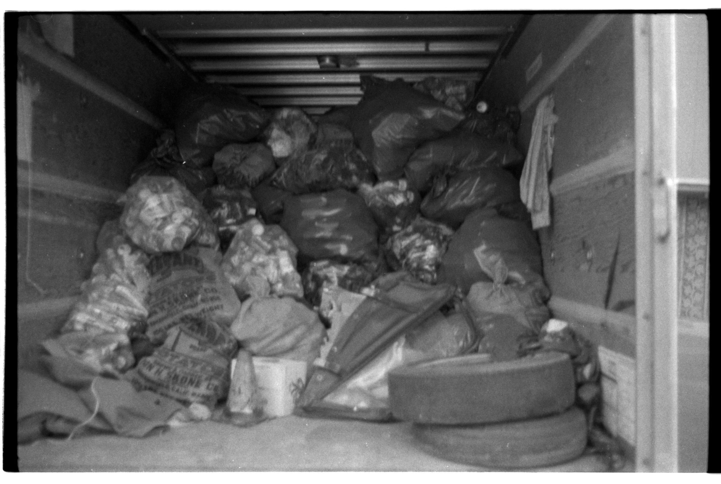 Negative, sheet film. 1 x 1.5 b&w. WSU Delta Tau Delta group brings truck to Olympia brewery to promote recycling.