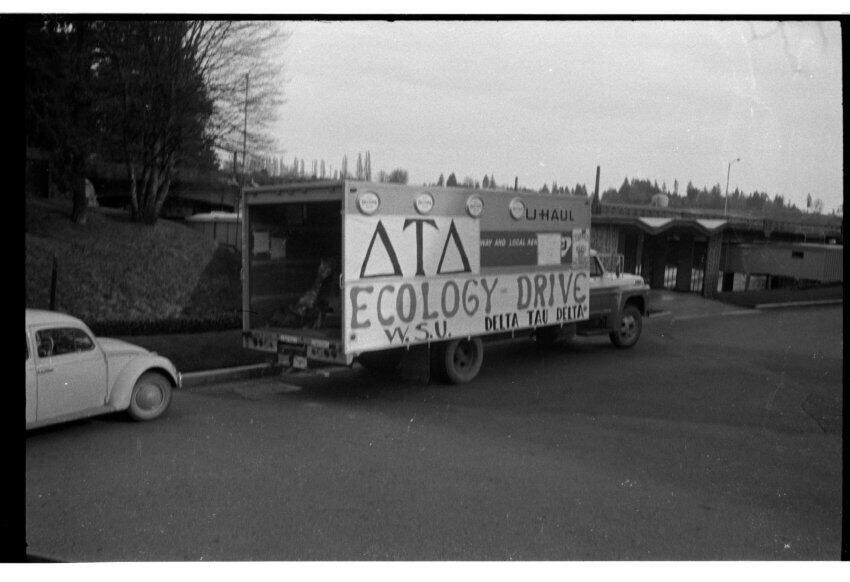 Negative, sheet film. 1 x 1.5 b&w. WSU Delta Tau Delta group brings truck to Olympia brewery to promote recycling.