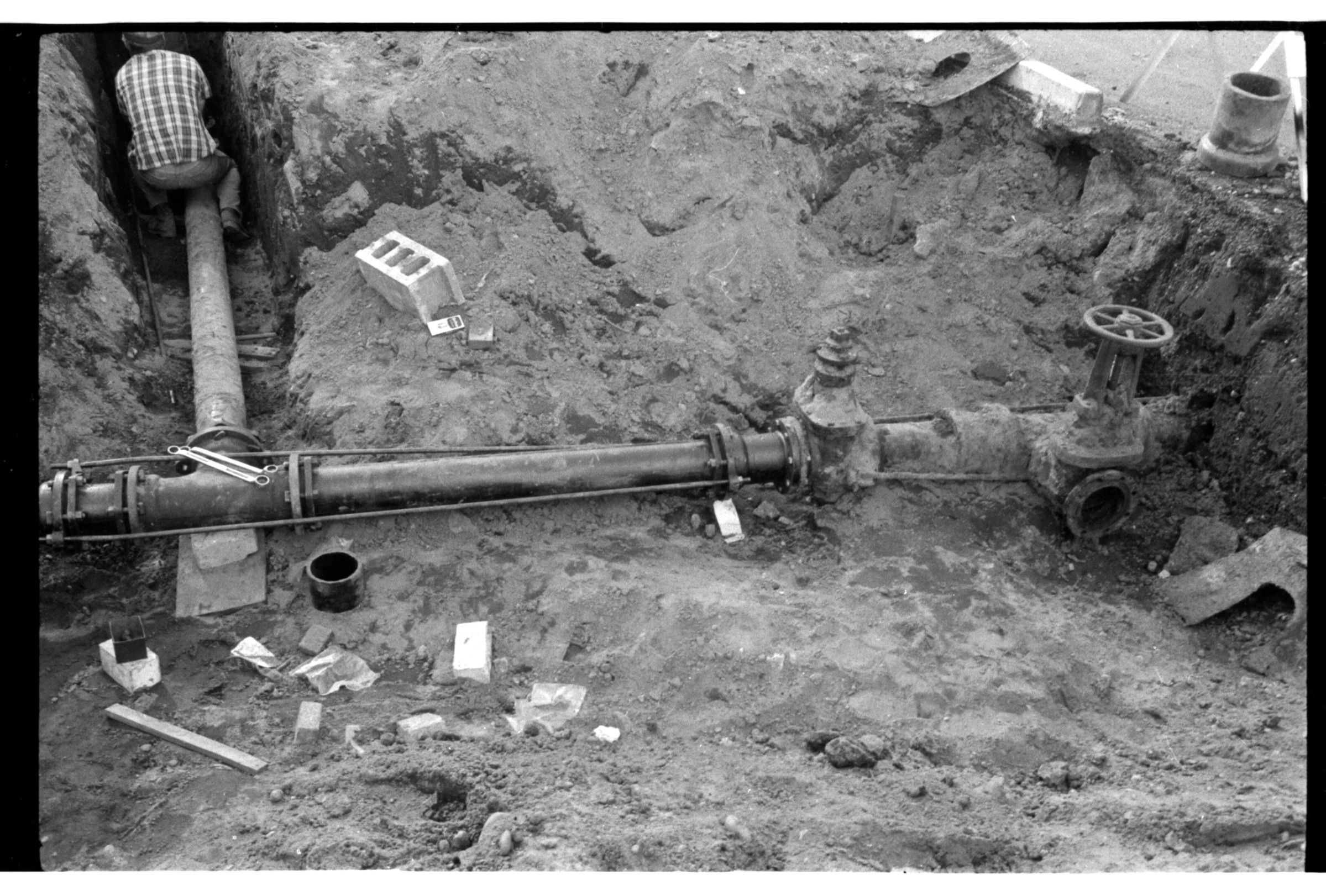 Negative, sheet film. 1 x 1.5 b&w. Fire hydrant plumbing.