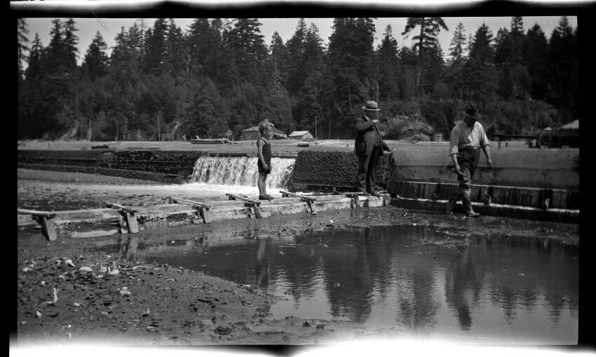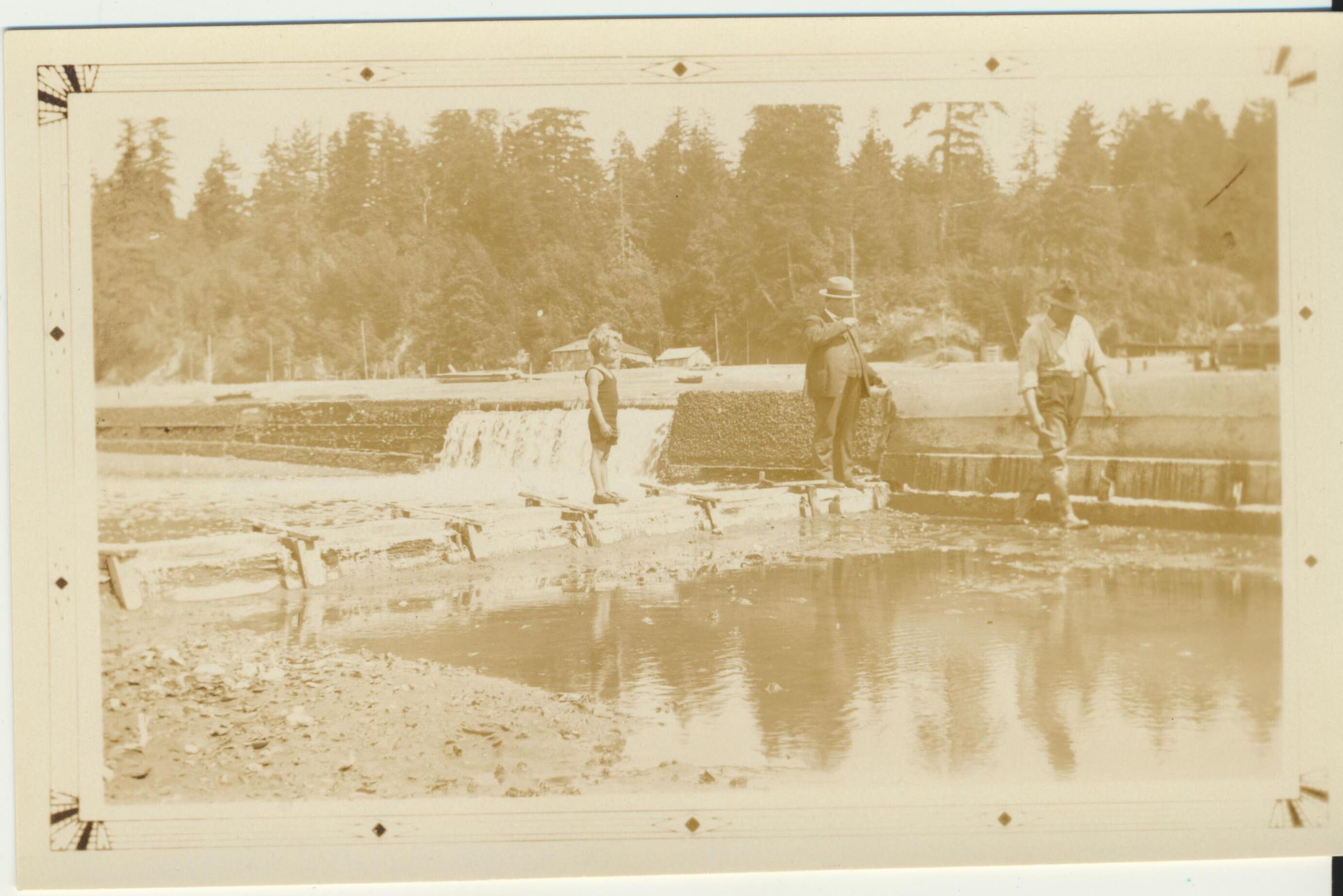 Negative, sheet film. 2.5 x 4.25 b&w. Blass Oyster Company, probably located on Totten Inlet near Kamilche, WA. Boy is Peter Schmidt Jr., man in suit is probably Adolph Schmidt Sr. No ID on 2nd man.Other Names and Numbers