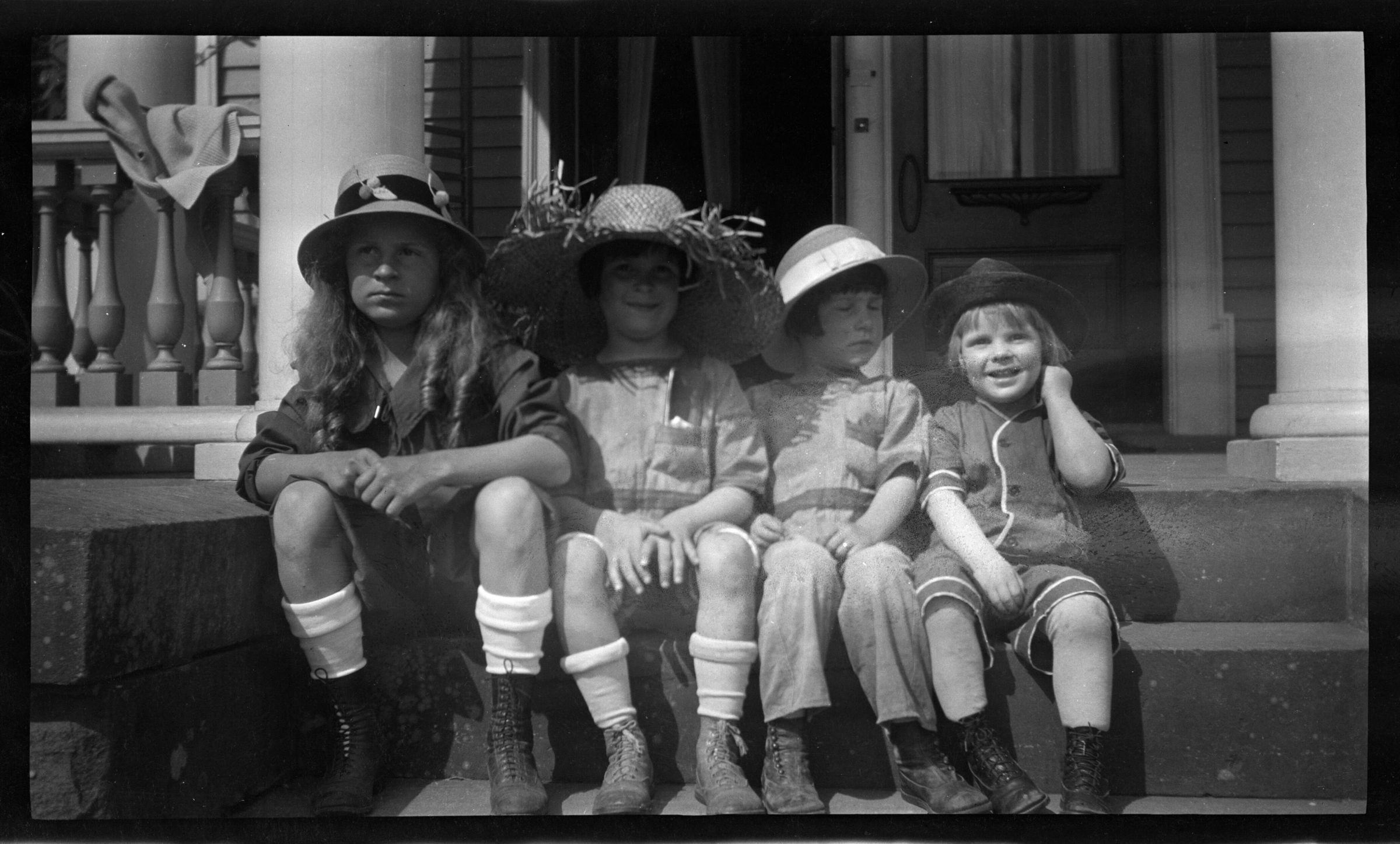Negative, sheet film. 2.5 x 4.25 b&w. Four daughters of Peter G. Schmidt Sr. and Clara Schmidt. Left to right: Clara "Nootchie", Marie "Sis", Margaret "Gradie", and Alice "Oodie".