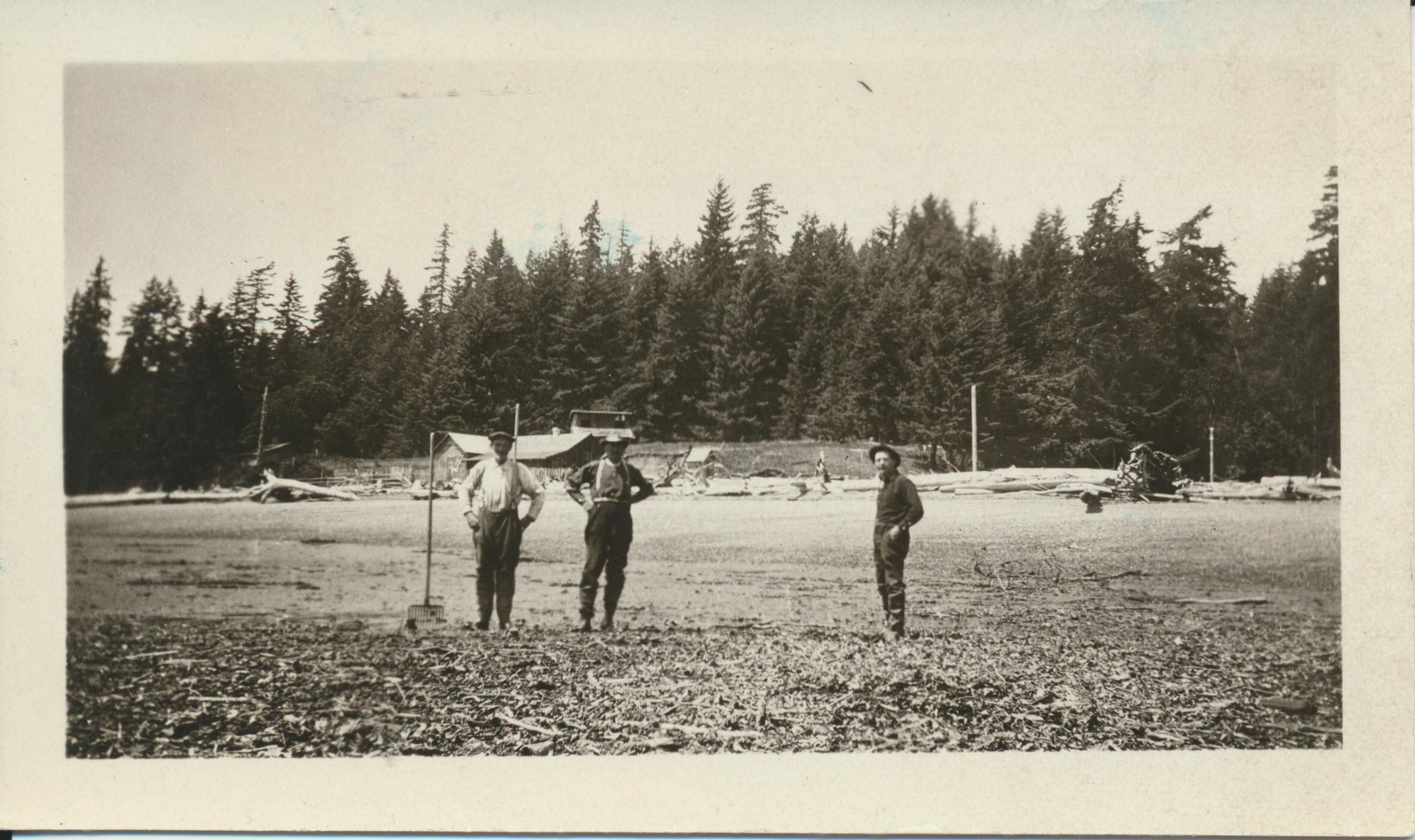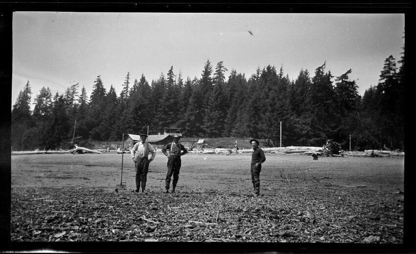Negative, sheet film. 2.5 x 4.25 b&w. Blass Oyster Company, probably located on Totten Inlet near Kamilche, WA. No ID on men.