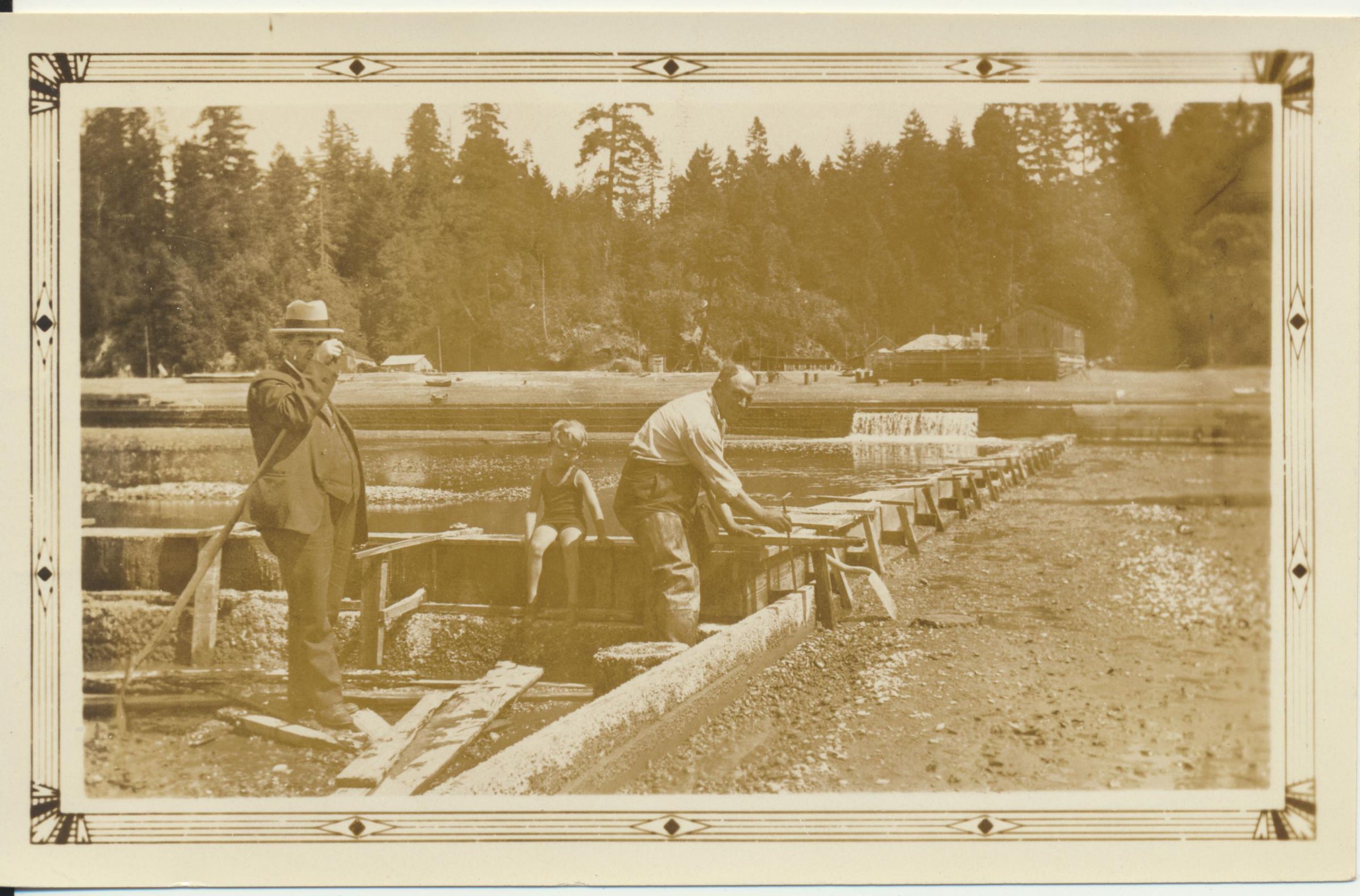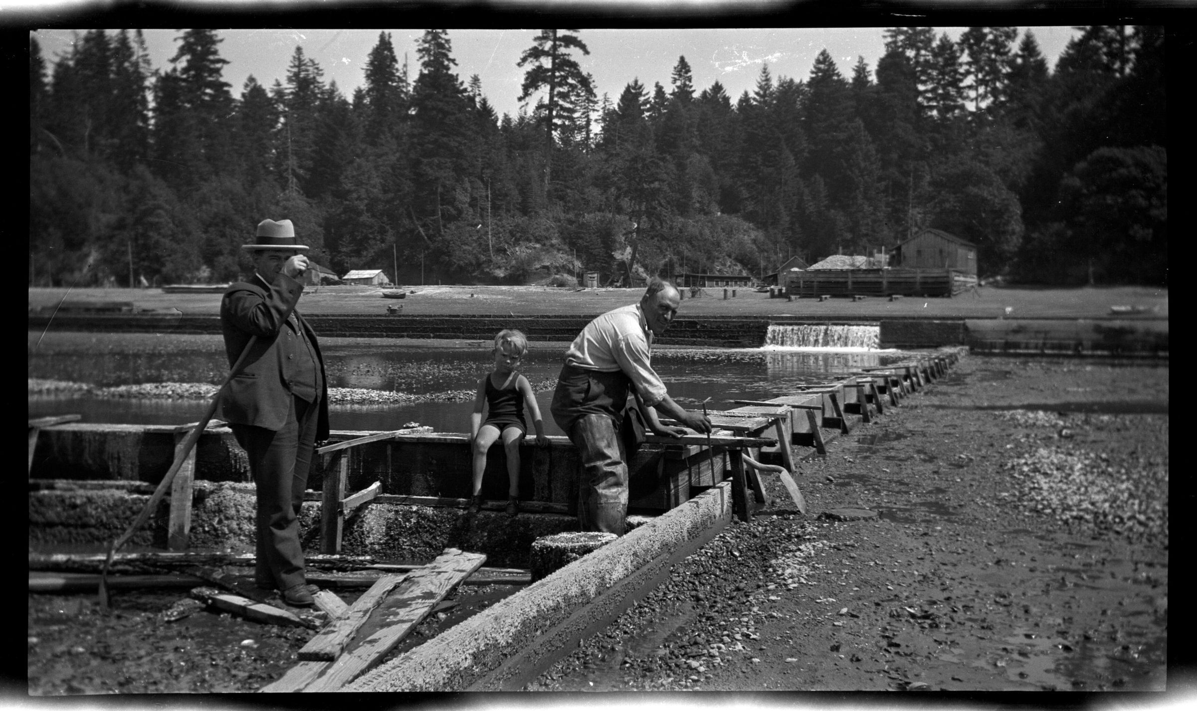 Negative, sheet film. 2.5 x 4.25 b&w. Blass Oyster Company, probably located on Totten Inlet near Kamilche, WA. Man in suit is probably Adolph Schmidt Sr. Boy is Peter Schmidt Jr. No ID on other man.Other Names and Numbers