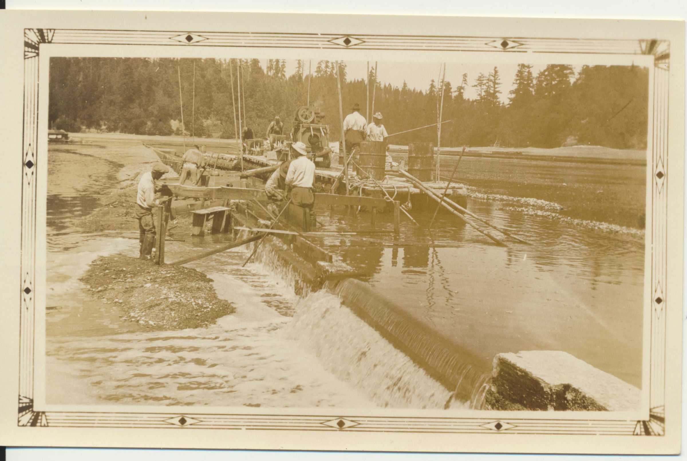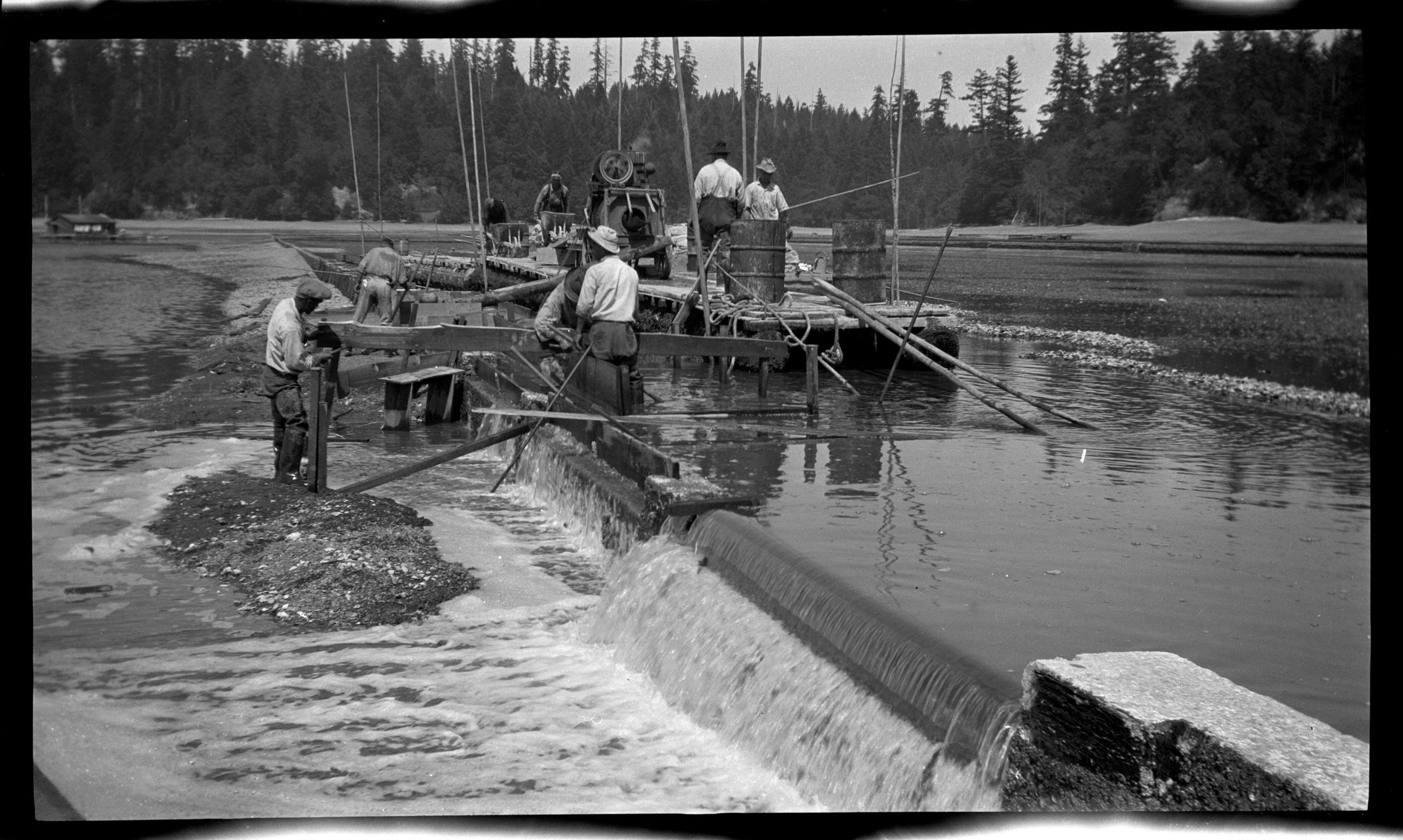 Negative, sheet film. 2.5 x 4.25 b&w. Blass Oyster Company, probably located on Totten Inlet near Kamilche, WA. No ID on men.