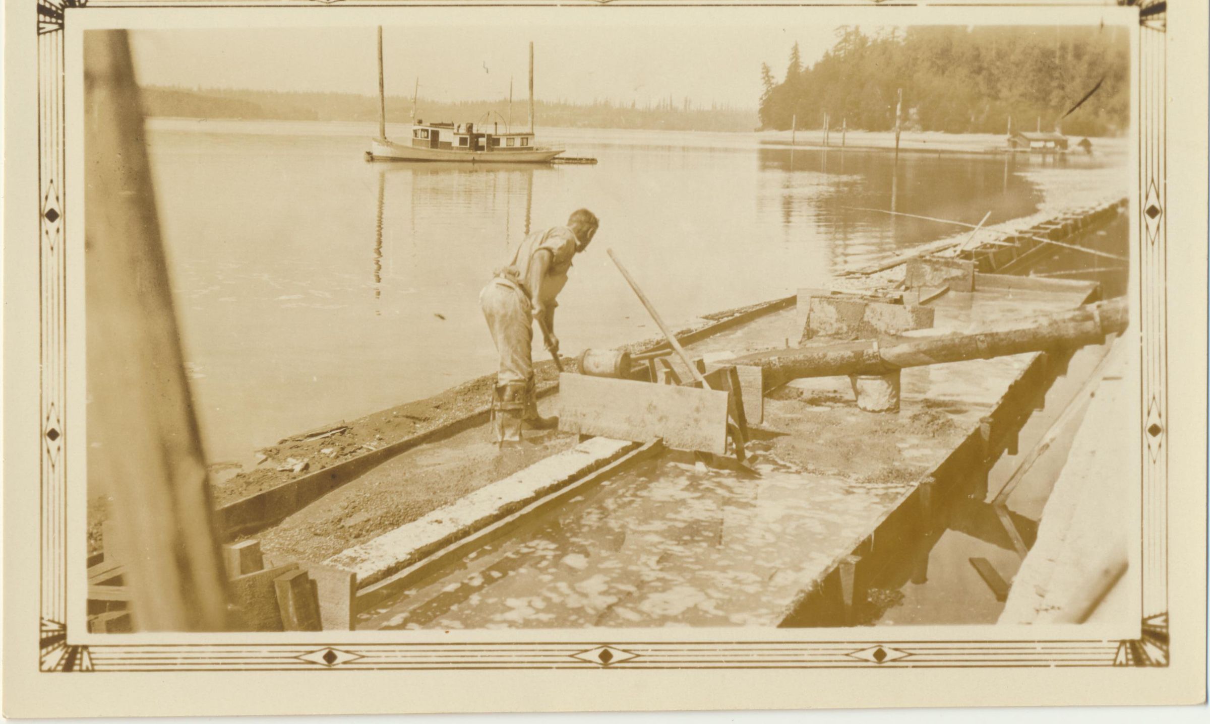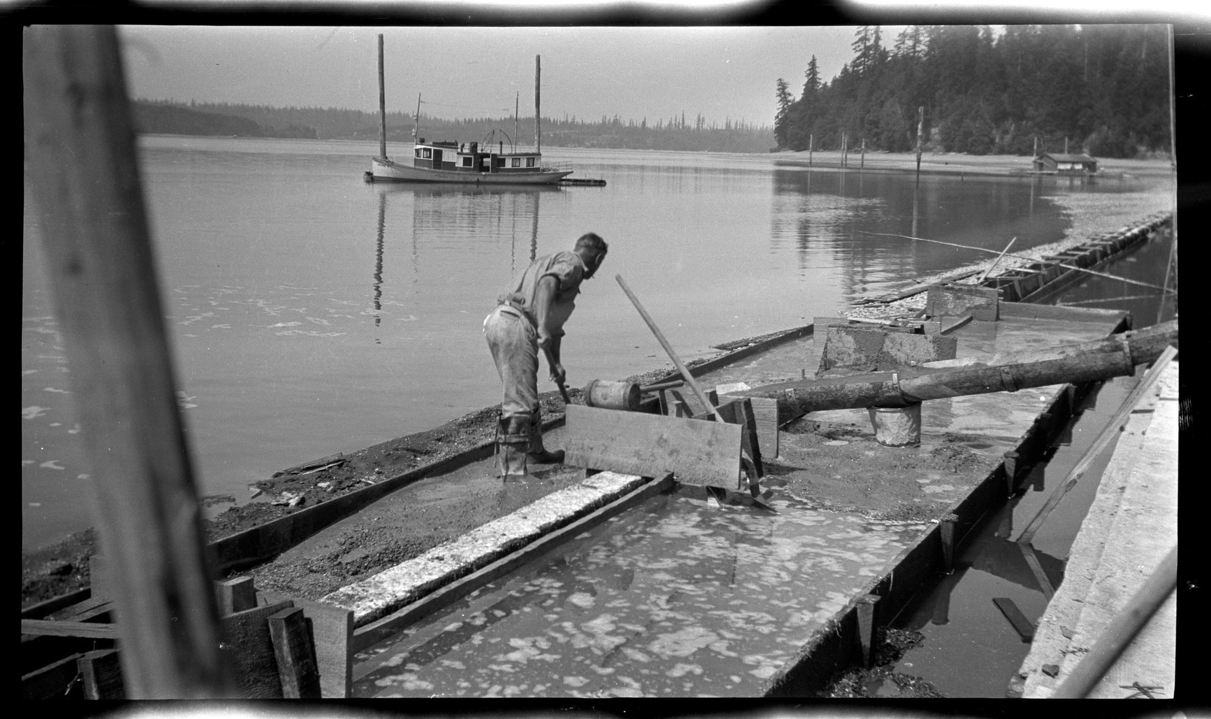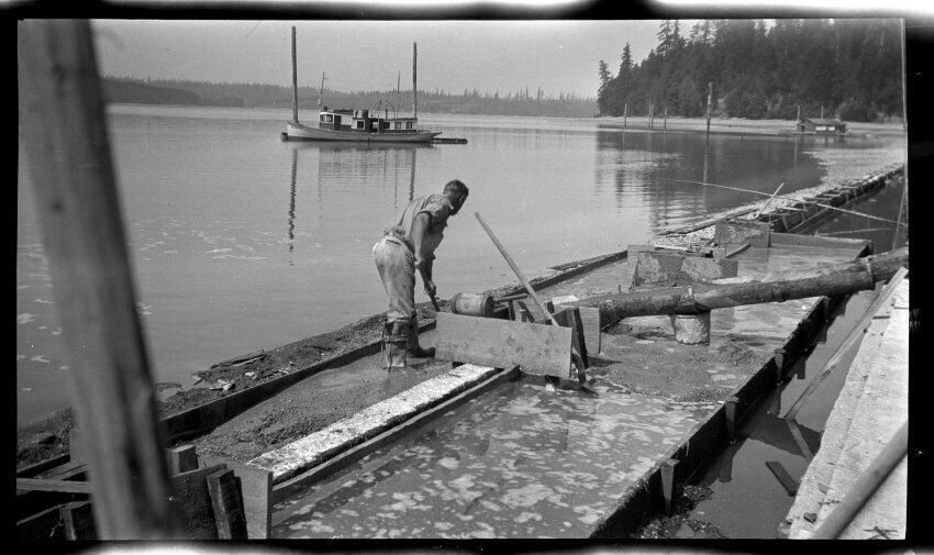 Negative, sheet film. 2.5 x 4.25 b&w. Blass Oyster Company, probably located on Totten Inlet near Kamilche, WA. No ID on man.