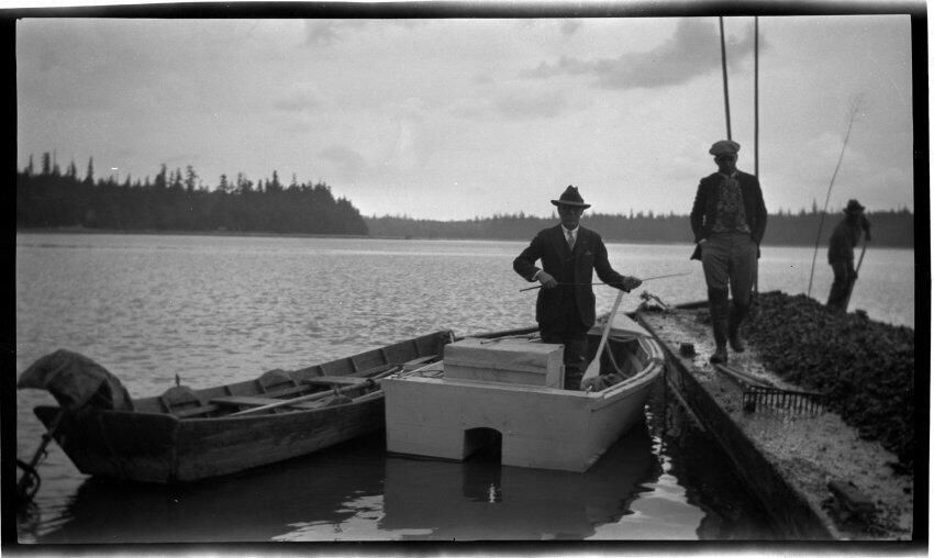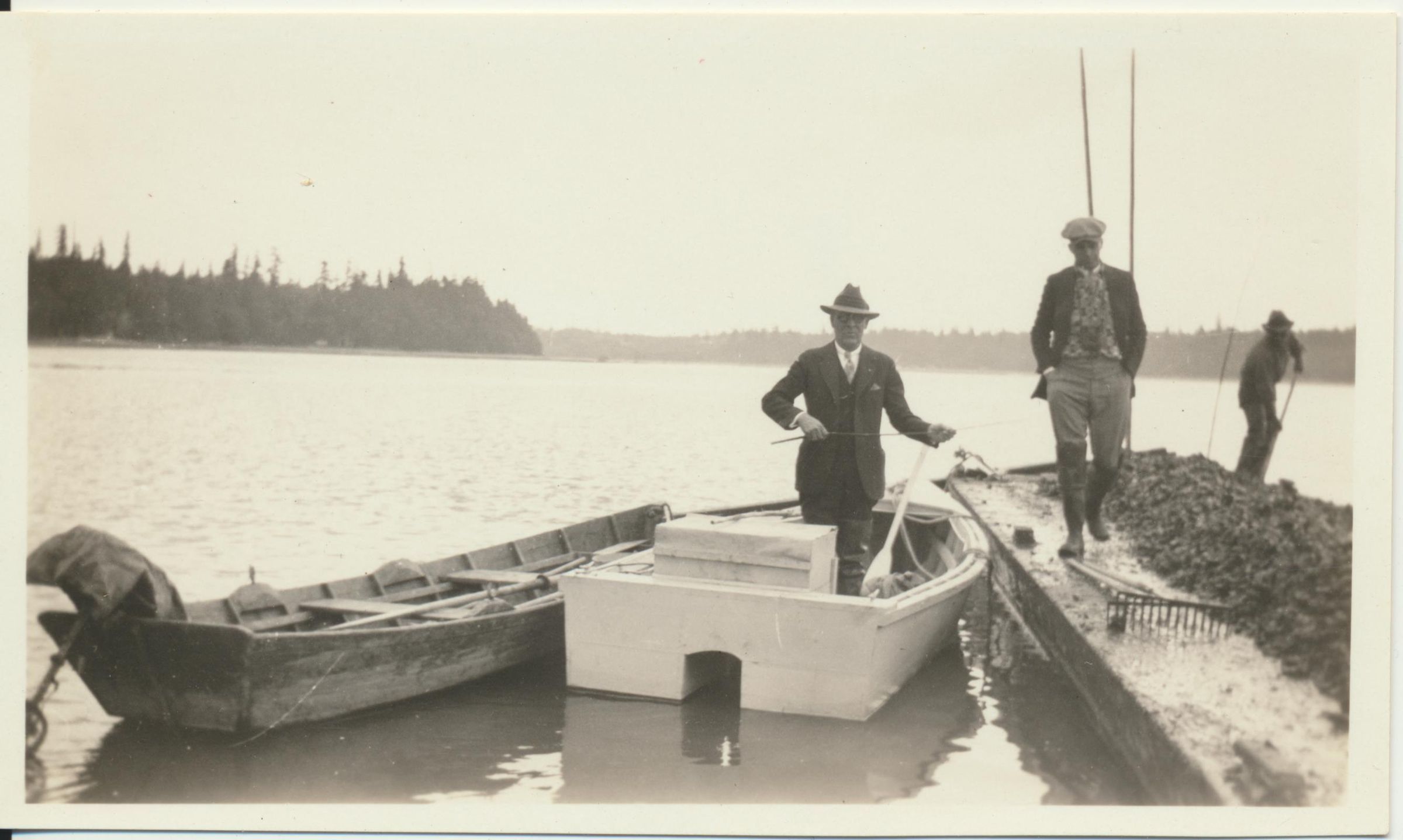 Negative, sheet film. 2.5 x 4.25 b&w. Schmidt family pictures. Boats on saltwater, near oyster operation, probably southern Puget Sound. Man in boat may be Fred Schmidt.
