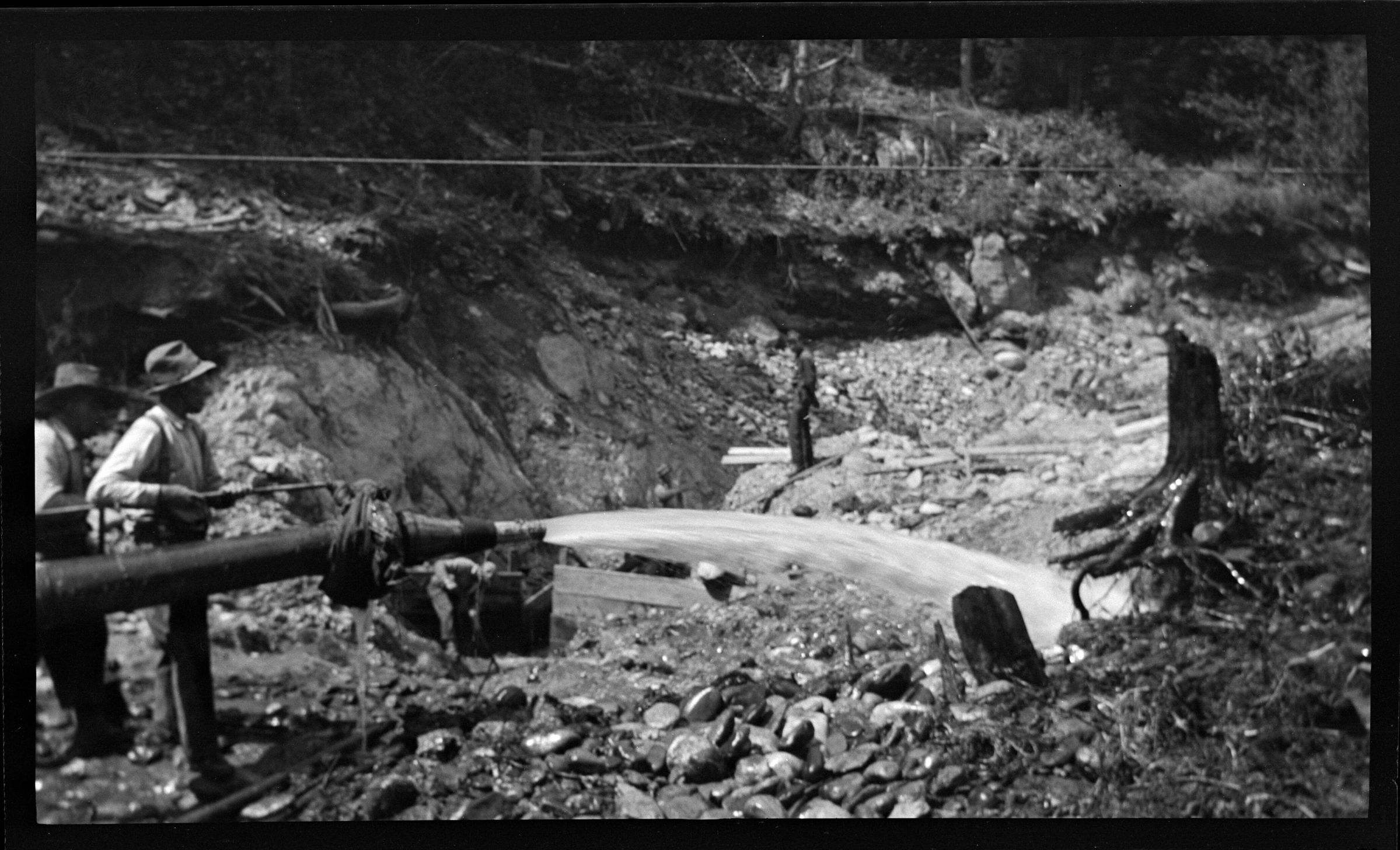 Negative, sheet film. 2.75 x 4.25 b&w. Schmidt family pictures. Hydraulic mining, possibly in Alaska. No ID on men.