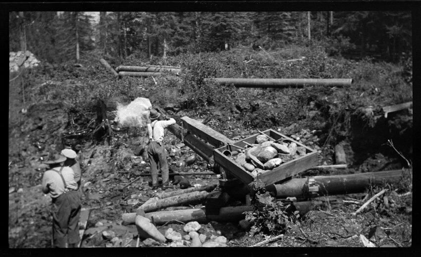 Negative, sheet film. 2.75 x 4.25 b&w. Schmidt family pictures. Hydraulic mining, possibly in Alaska. No ID on men.