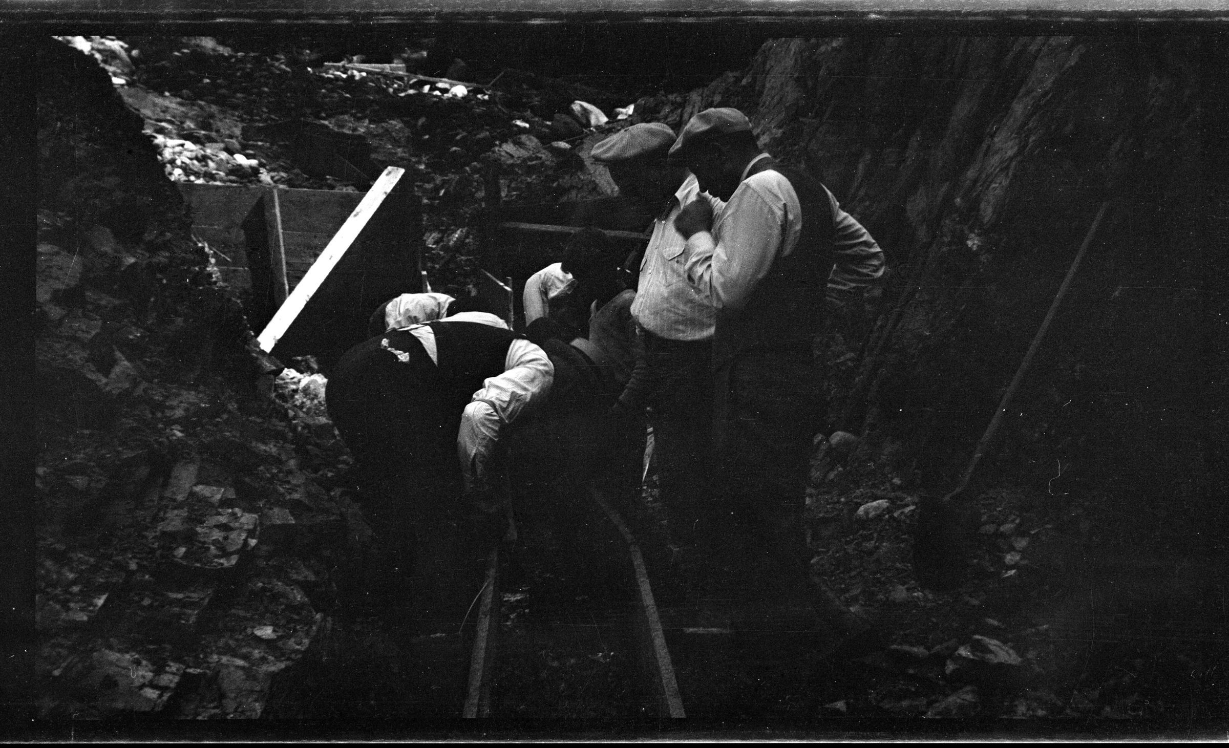 Negative, sheet film. 2.75 x 4.25 b&w. Schmidt family pictures. Hydraulic mining, possibly in Alaska. No ID on men.