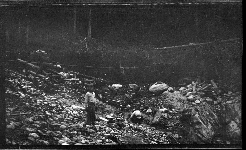 Negative, sheet film. 2.75 x 4.25 b&w. Schmidt family pictures. Hydraulic mining, possibly in Alaska. No ID on men.