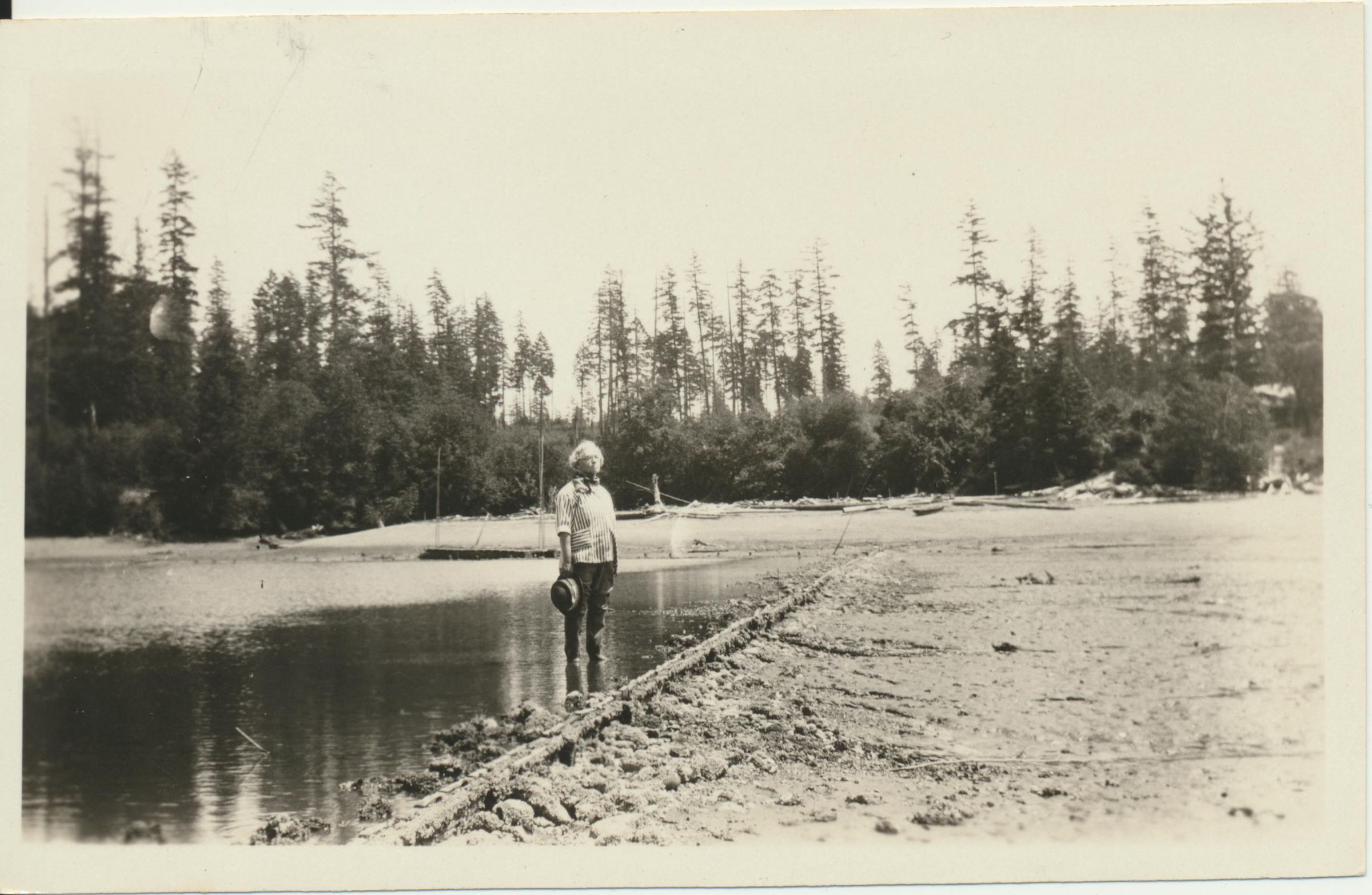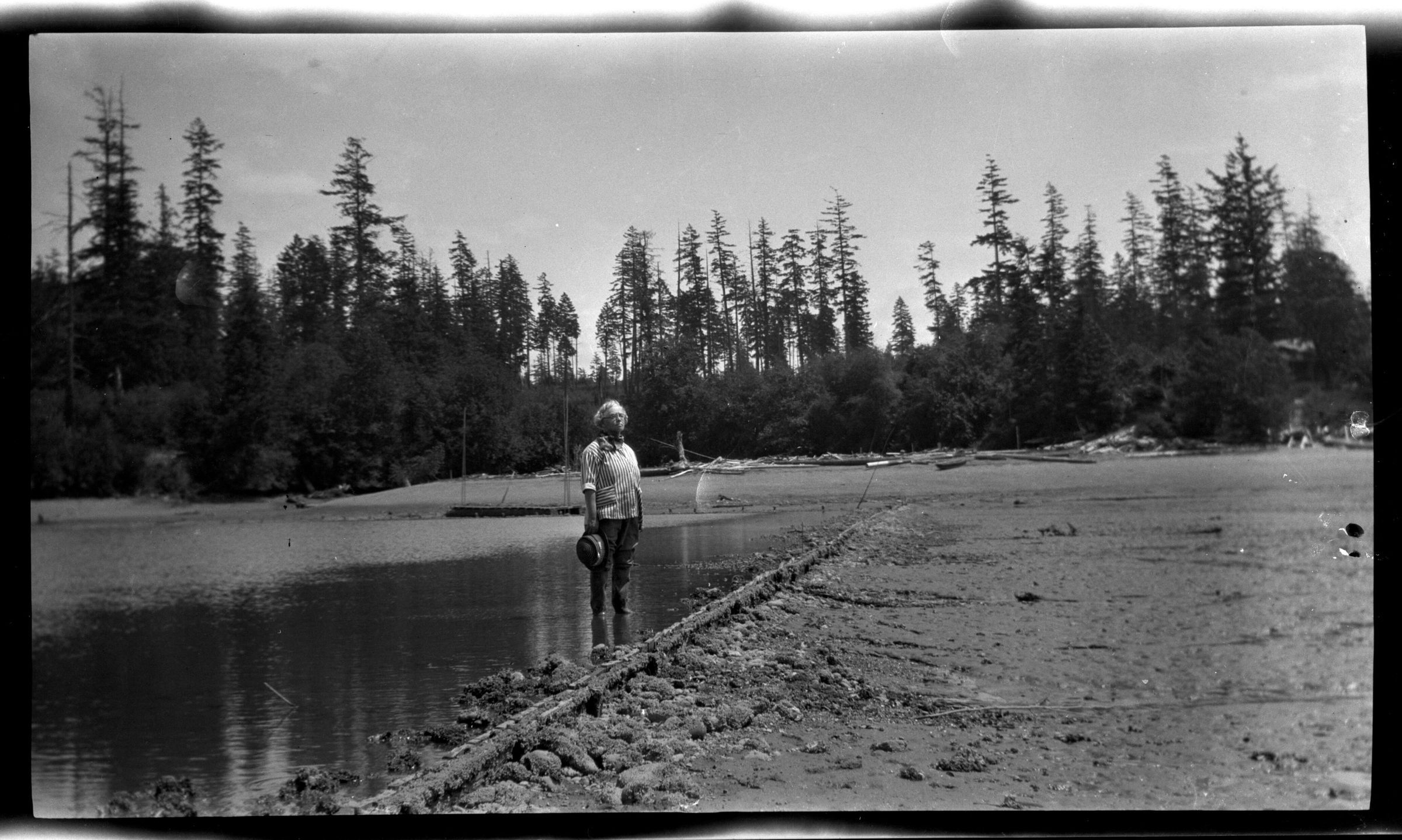 Negative, sheet film. 2.5 x 4.25 b&w. Schmidt family pictures. Oyster farm probably on southern Puget Sound. No ID on man.