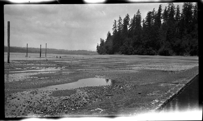 Negative, sheet film. 2.5 x 4.25 b&w. Schmidt family pictures. Oyster farm probably on southern Puget Sound.