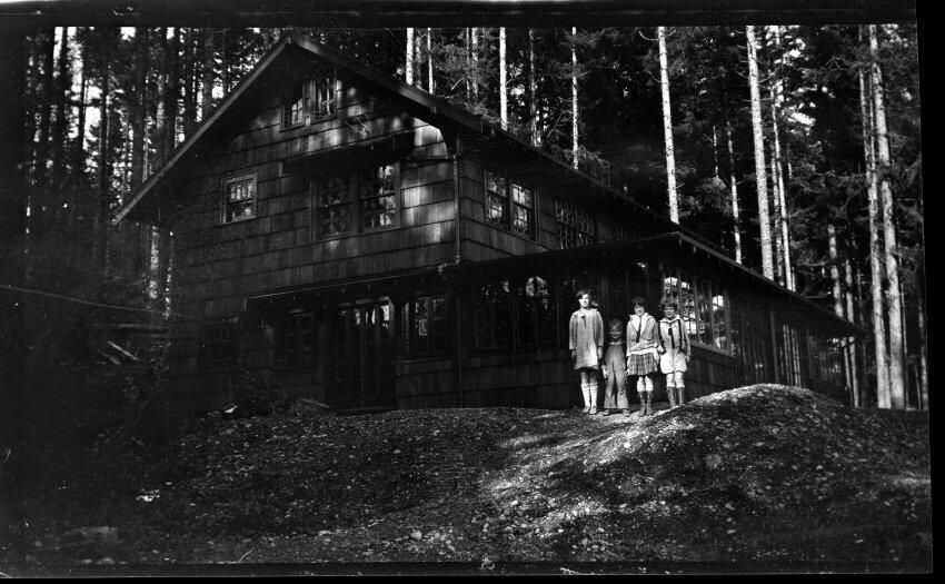 Negative, sheet film. 2.5 x 4.25 b&w. Schmidt family pictures. Four children, probably children of Peter G. and Clara Schmidt, at cabin in forest. Probably located on Cooper Point, north of Olympia.Name/Title