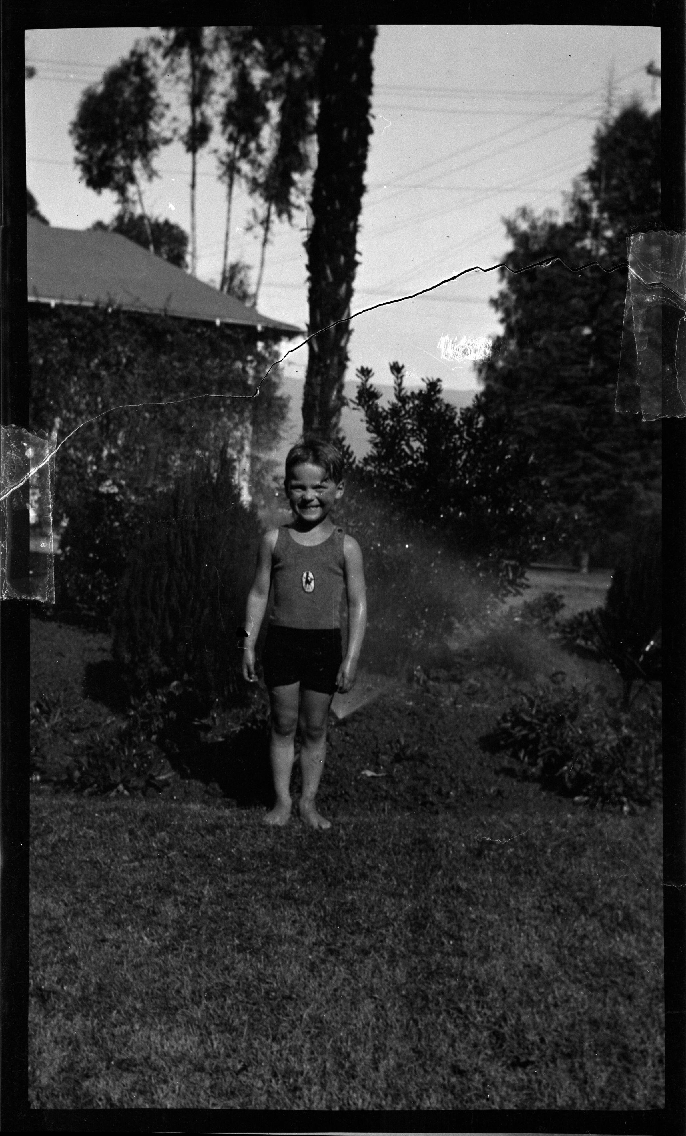 Negative, sheet film. 4.25 x 2.5 b&w. Schmidt family pictures. Peter G. Schmidt Jr. with palm tree, possibly in southern California. Photo torn in half.