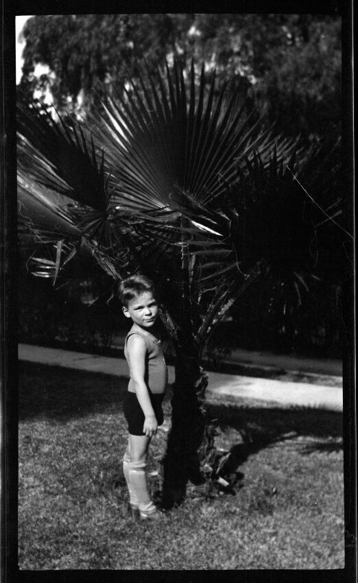 Negative, sheet film. 4.25 x 2.5 b&w. Schmidt family pictures. Peter G. Schmidt Jr. with palm tree, possibly in southern California.