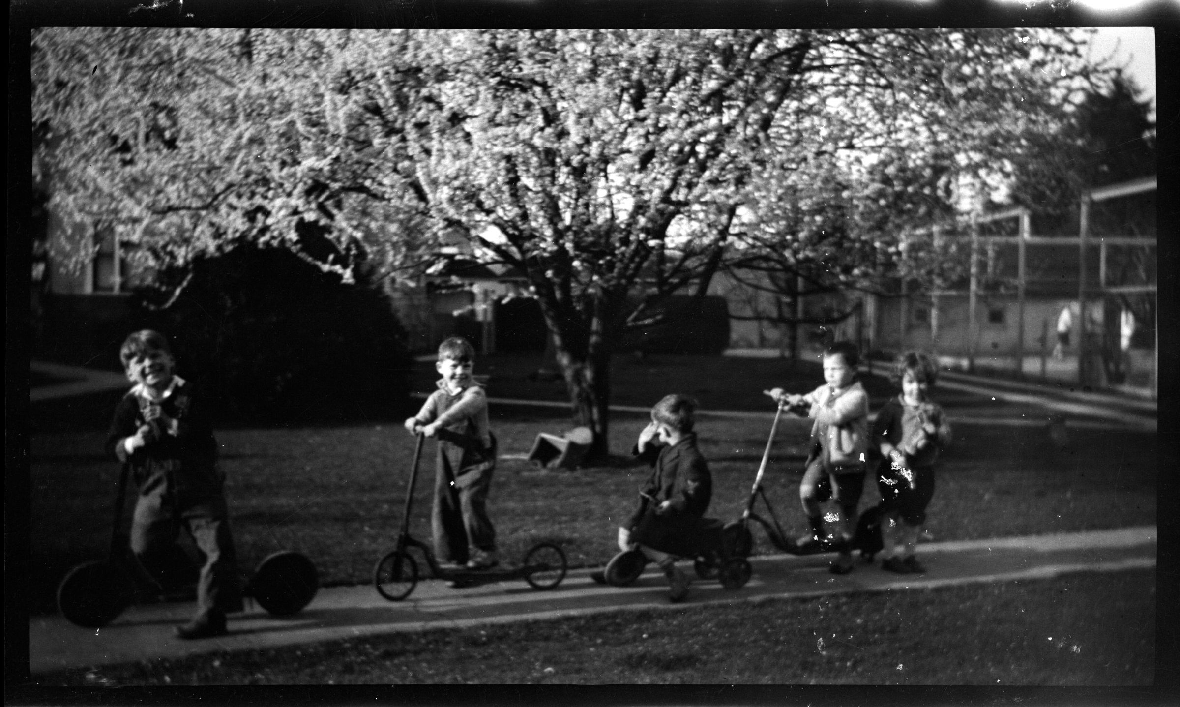 Negative, sheet film. 2.5 x 4.25 b&w. Schmidt family pictures. 5 unidentified children playing in front yard of Schmidt House.