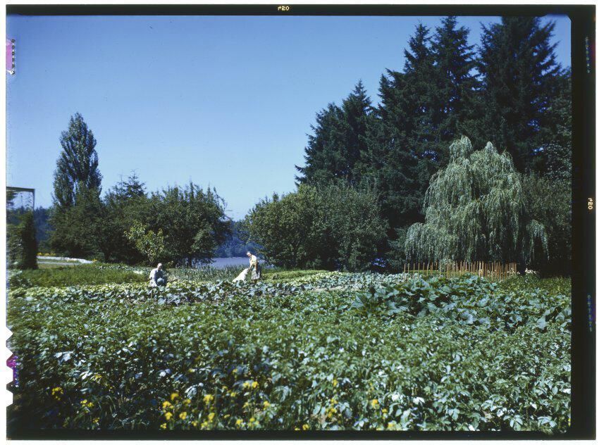 Negative, sheet film. 3.25 x 4.5 b&w. Clara Schmidt, familiy dog, and unidentified man in large garden at Schmidt House.