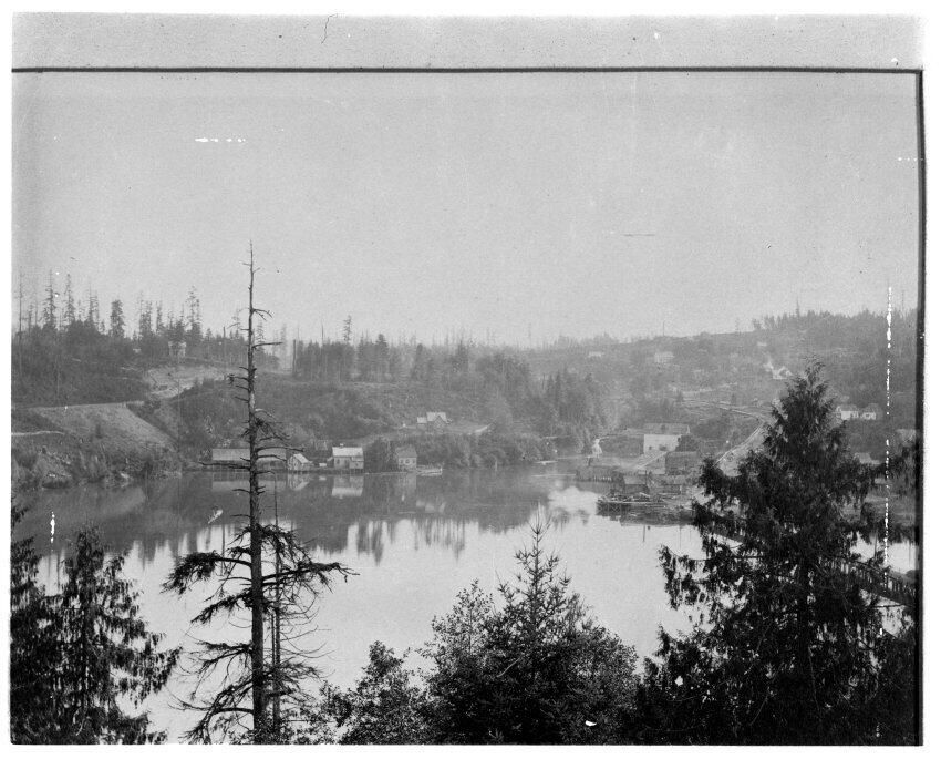 Negative, sheet film. 4 x 5 b&w. South end of Budd Inlet/Puget Sound, mouth of Deschutes River. Buildings on left are Carter and Biles tannery. Buildings on right include Lincoln Flour Mill, other industrial sites.Name/Title
