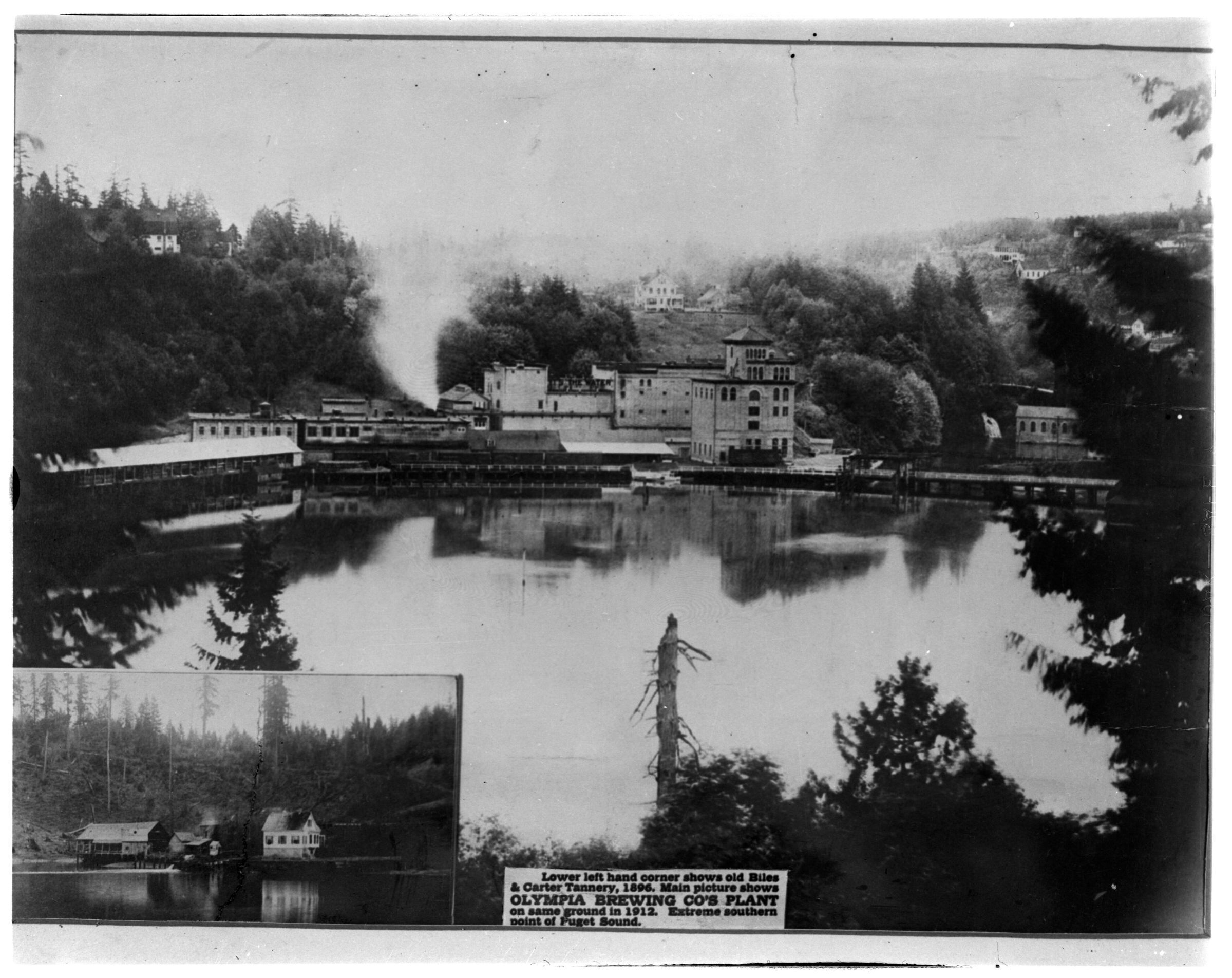Negative, sheet film. 4 x 5 b&w. Inset photo at lower left shows Carter and Biles tannery property ca 1895. Larger photo shows Olympia brewery. Caption says larger photo is from 1912, but this is wrong. Couldn't be later than early 1909, as that's when the spent grains building was erected immediately to the west of the brick brewhouse. But the spent grains building does not appear in this photo. Also, addition is not yet on Schmidt House; addition appeared in 1910.Name/Title