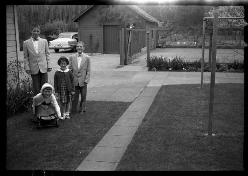 Negative, sheet film. 1 x 1.5 b&w. No ID on children. Shows yard and garden shed at Schmidt House.