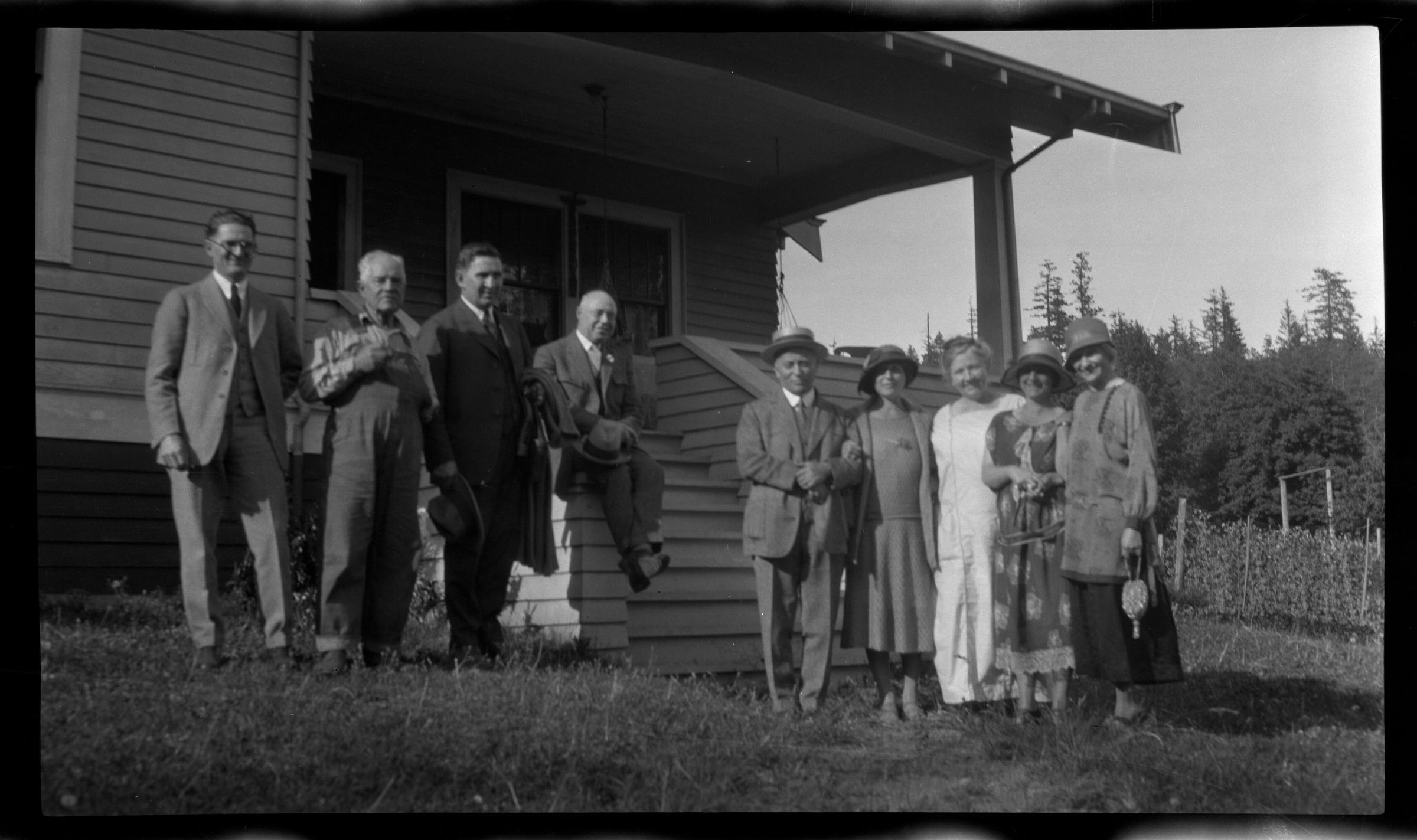 Negative, sheet film. 3.25 x 5.5 b&w. Group of people in front of house. Unknown location. Peter G. Schmidt Sr. at far left, Adolph Schmidt Sr. 3rd from left. No ID on others.