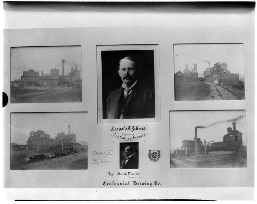 Negative, sheet film. 4 x 5 b&w. Matted photos showing Leopold F. Schmidt in center, Henry Mueller (president of Centennial Brewing) at bottom, surrounded by 4 views of Centennial brewery in Butte MT.Name/Title