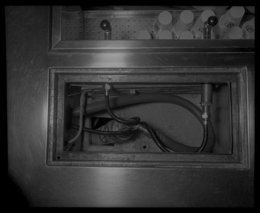 Negative, sheet film. 4 x 5 b&w. Tap handle, top view. Cups at top.