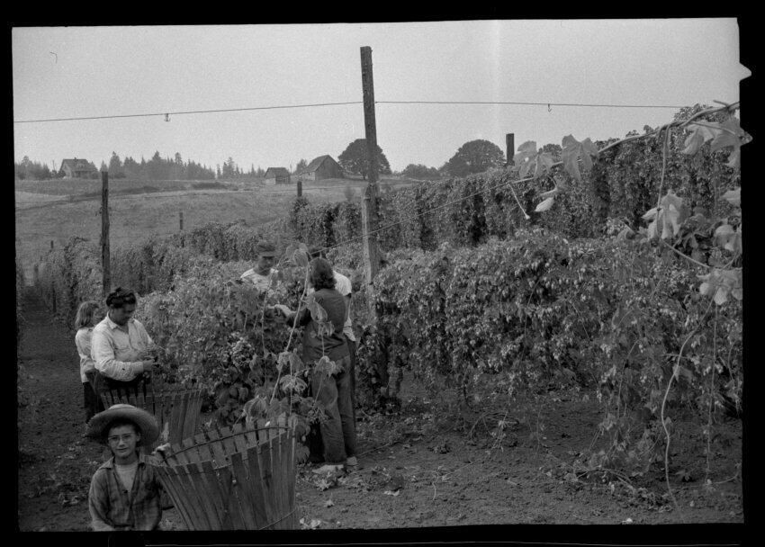 Negative, sheet film. 1 x 1.5 b&w. Hop farming at unknown location, probably western Washington. Shows workers in hop field with buildings in distance.