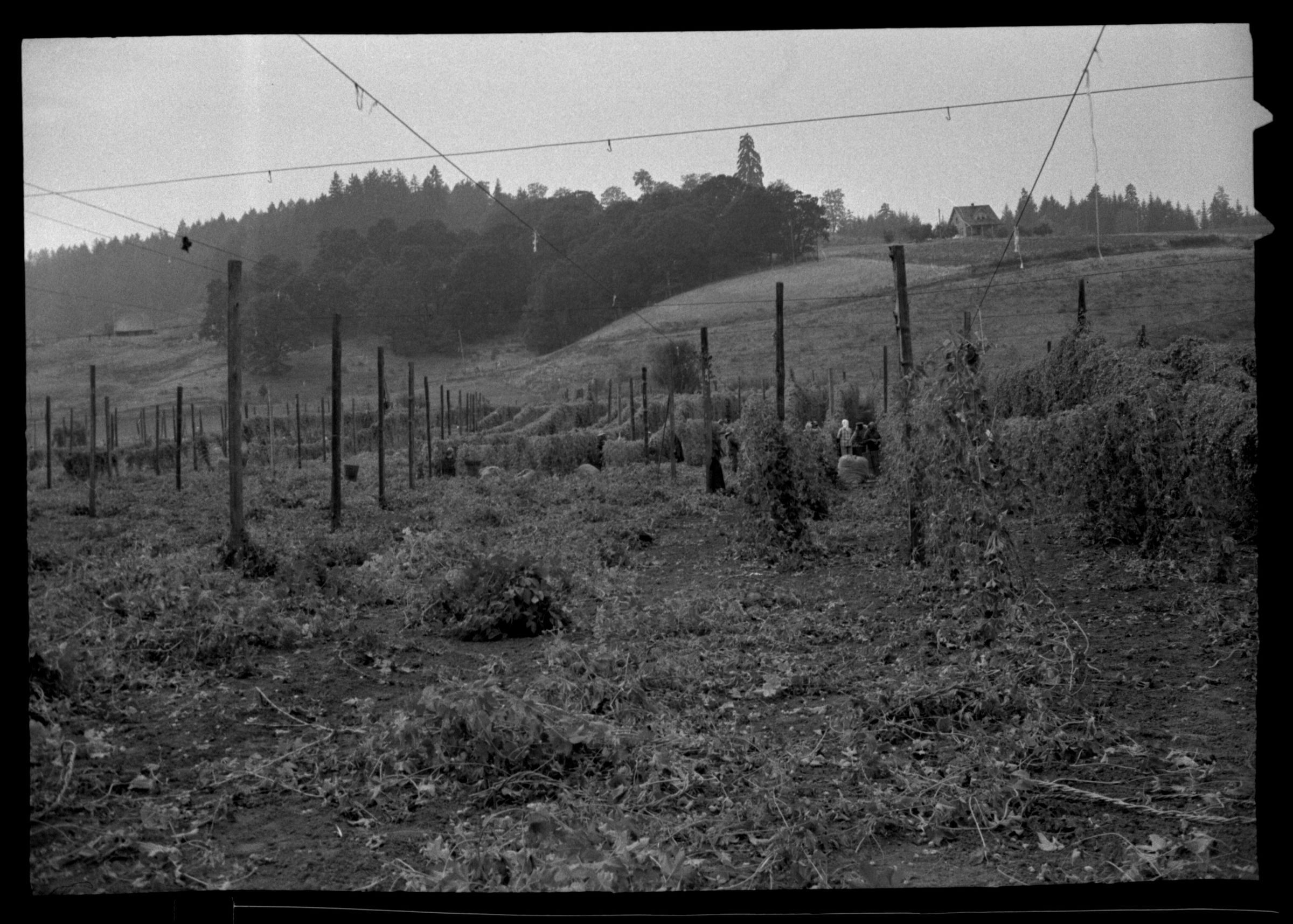 Negative, sheet film. 1 x 1.5 b&w. Hop farming at unknown location, probably western Washington. Shows workers in hop field with buildings in distance.