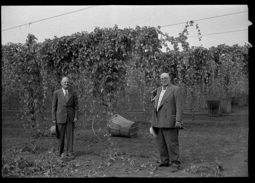 Negative, sheet film. 1 x 1.5 b&w. Hop farming at unknown location, probably western Washington. Peter G. Schmidt Sr. on left, unknown man at right.