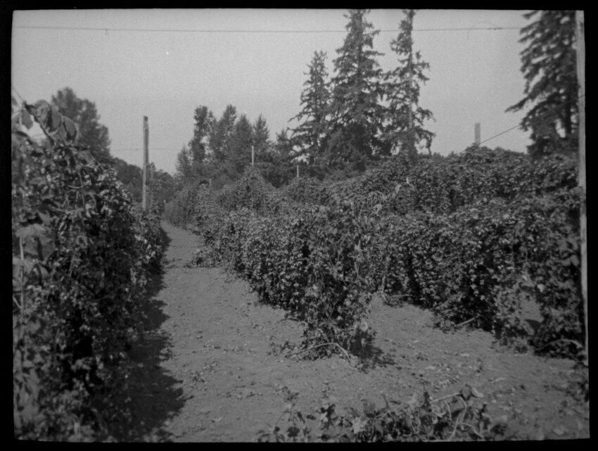Negative, sheet film. 1 x 1.5 b&w. Hop farming at unknown location, probably western Washington.