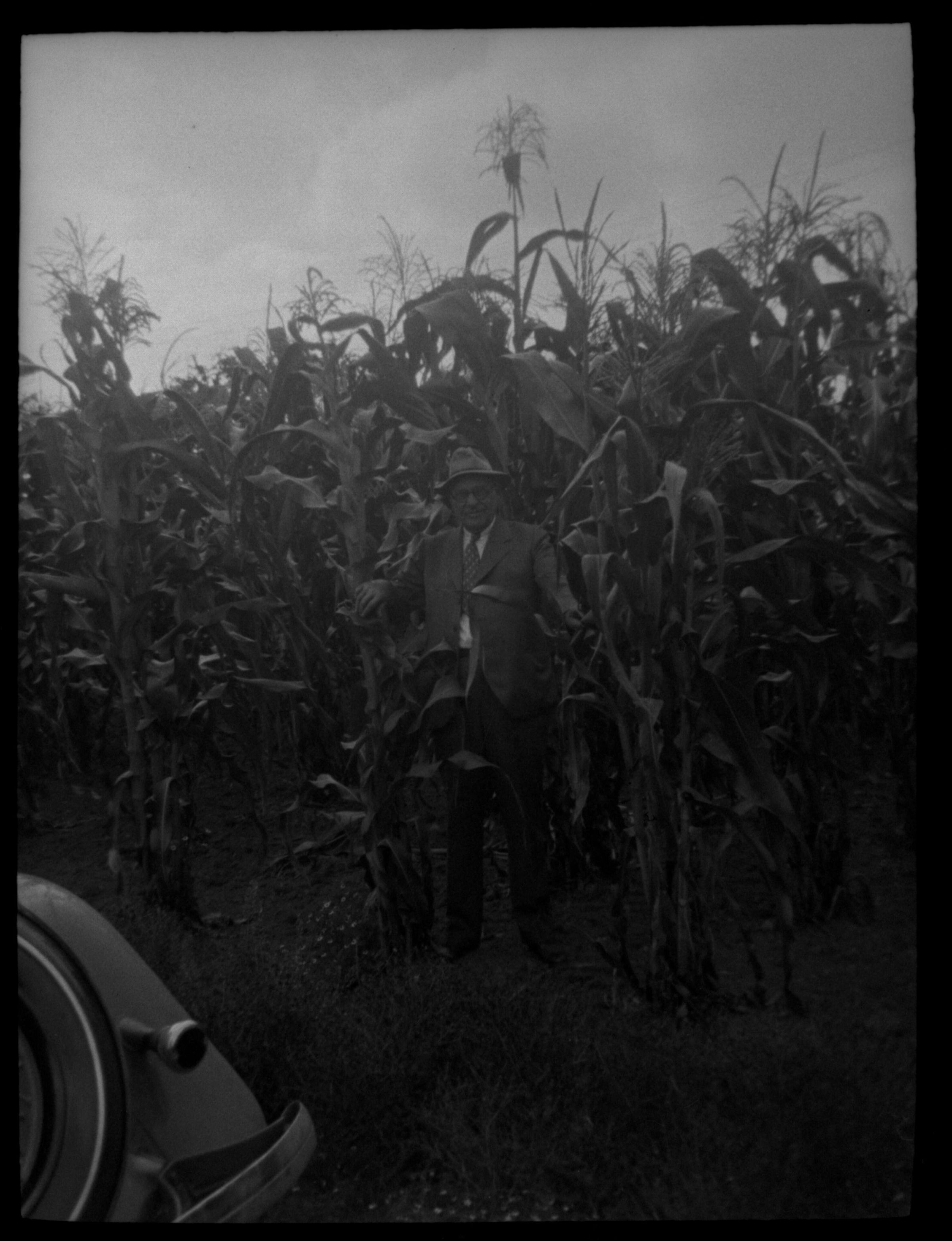 Negative, sheet film. 1 x 1.5 b&w. Hop farm at unknown location, probably western Washington. Shows unidentified man in field of corn.