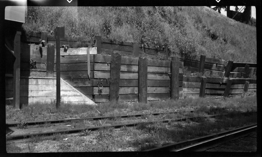 Negative, sheet film. 2.5 x 4.5 b&w. Timber retaining wall along Olympia brewery property. Rail line in foreground.