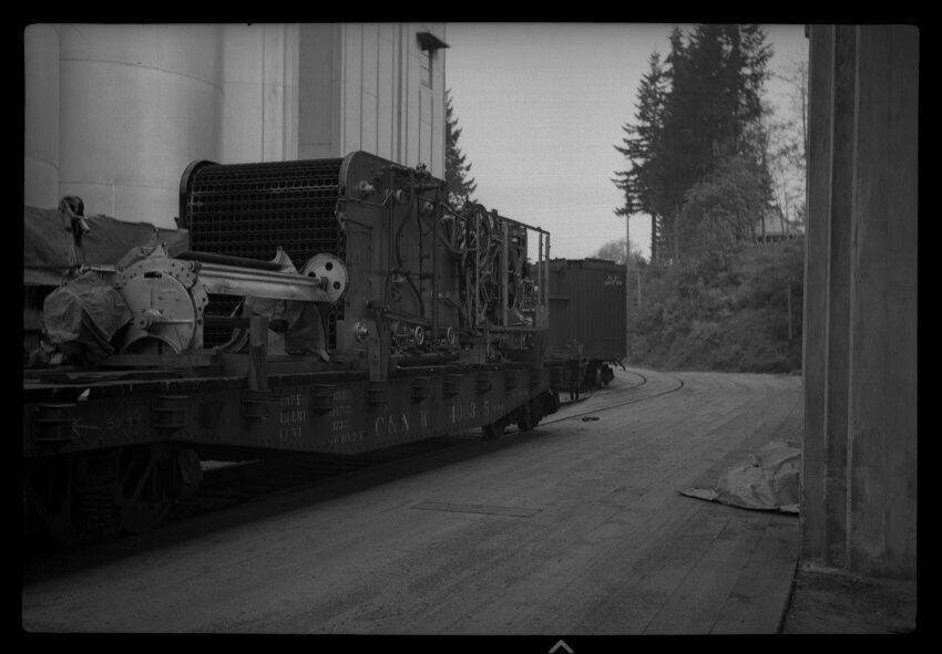 Negative, sheet film. 2.25 x 3.5 b&w. Soaker coming in by railcar.
