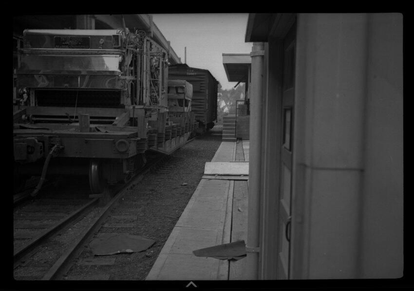 Negative, sheet film. 2.25 x 3.5 b&w. Soaker coming in by railcar.