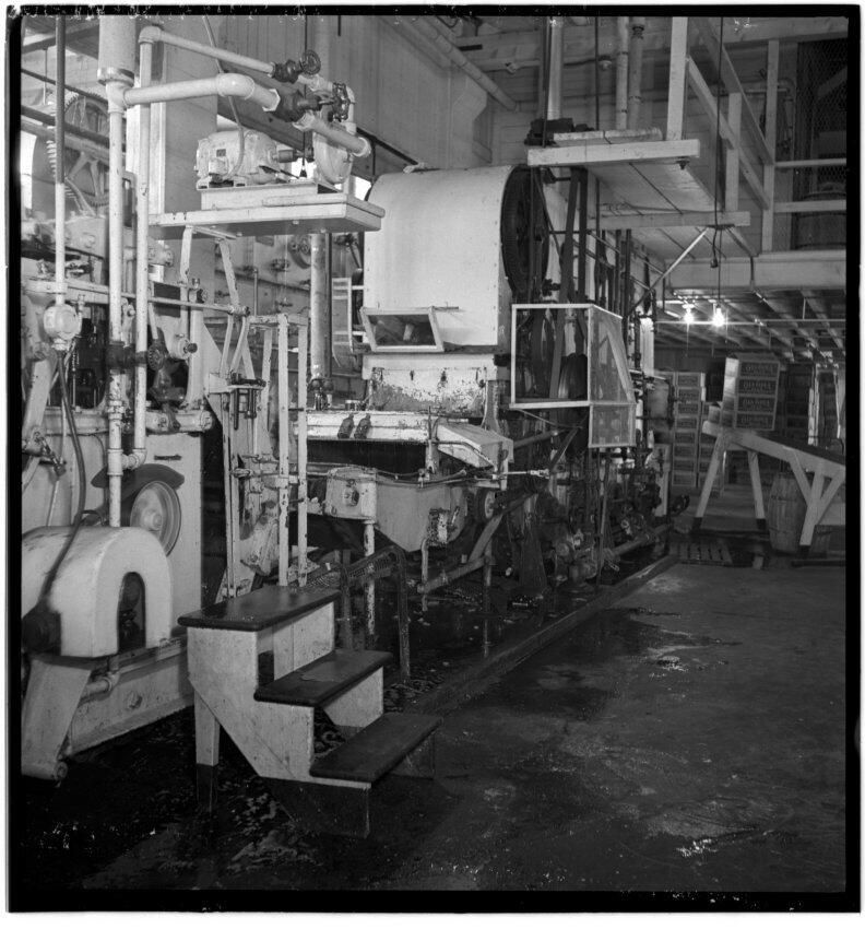 Negative, sheet film. 2.5 x 2.5 b&w. Infeed of a bottle washer.