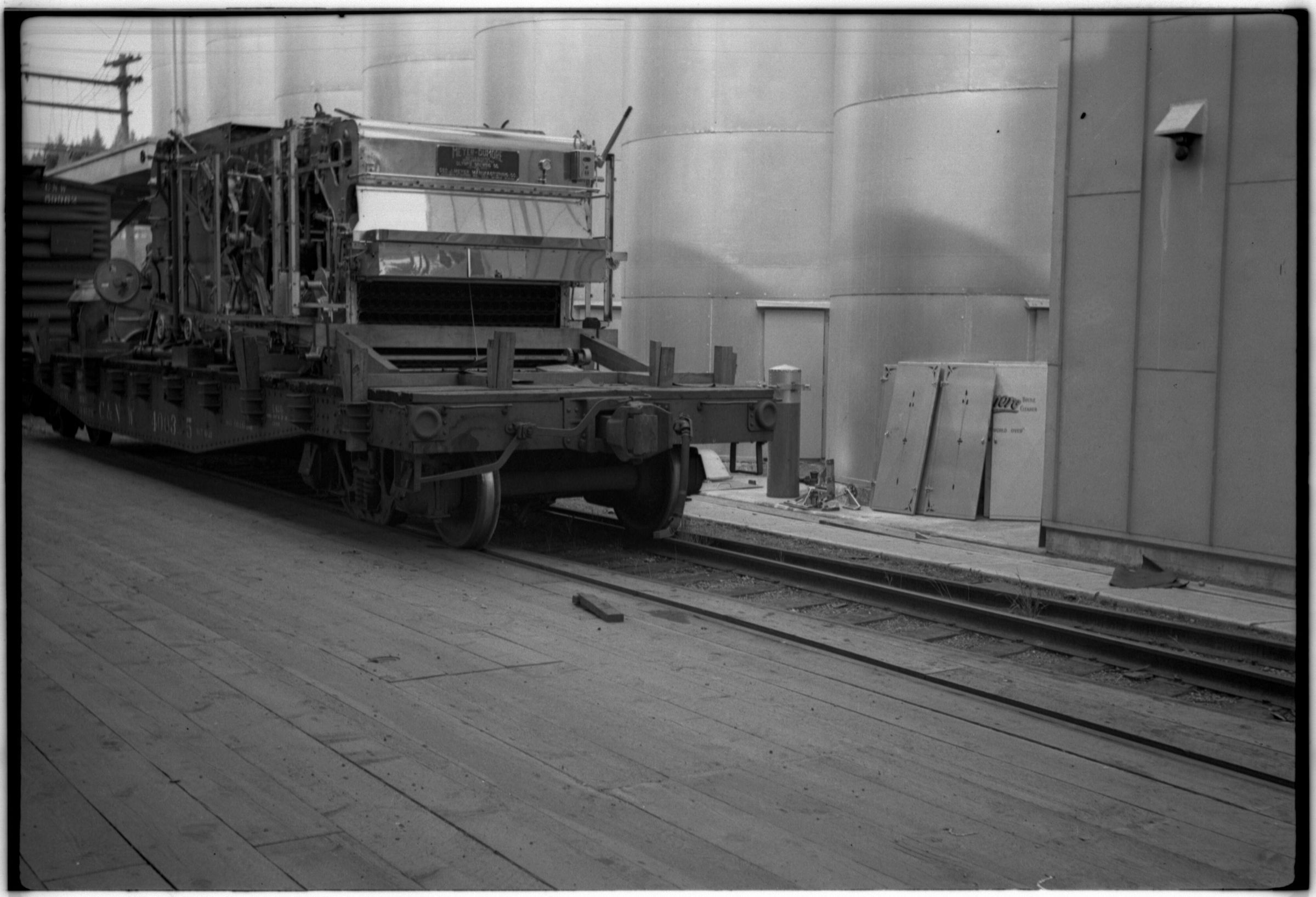 Negative, sheet film. 2.25 x 3.5 b&w. Soaker coming in by railcar.
