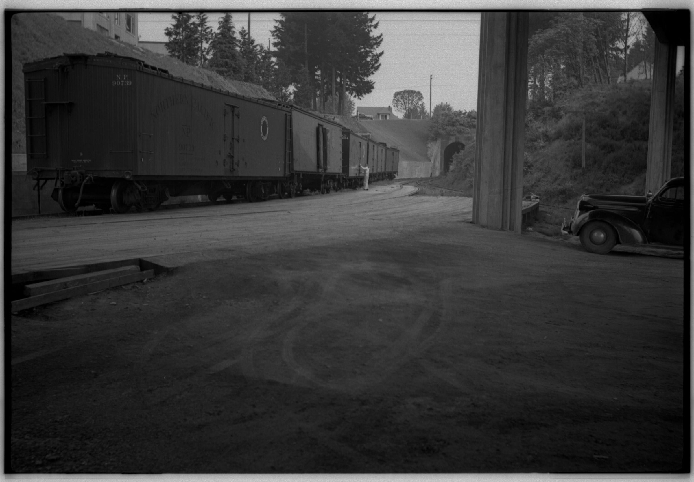 Negative, sheet film. 2.25 x 3.5 b&w. Rail line, box cars, and tunnel along edge of Olympia brewery.