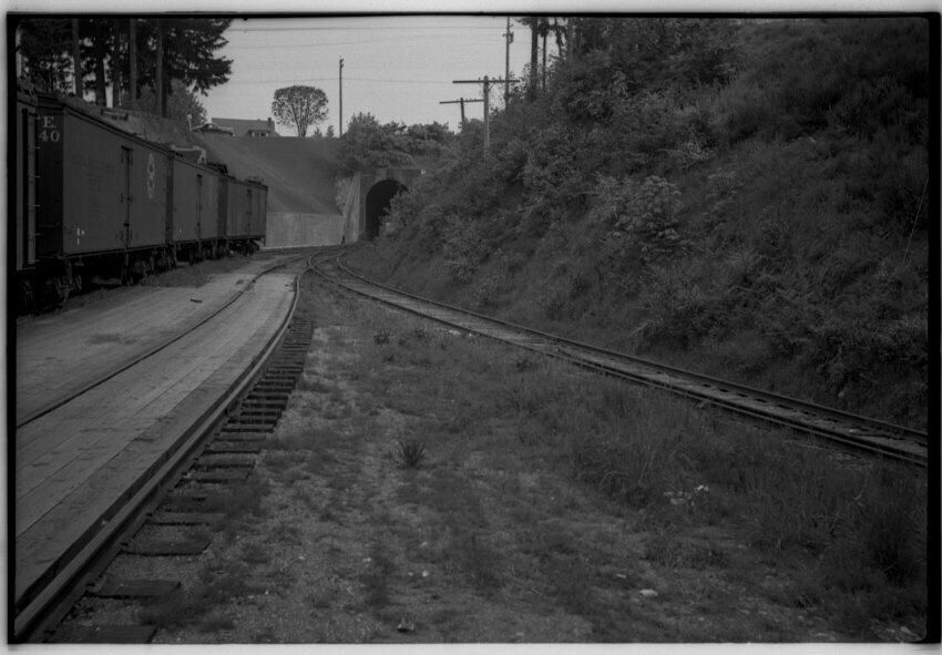 Negative, sheet film. 2.25 x 3.5 b&w. Rail line and tunnel along edge of Olympia brewery.