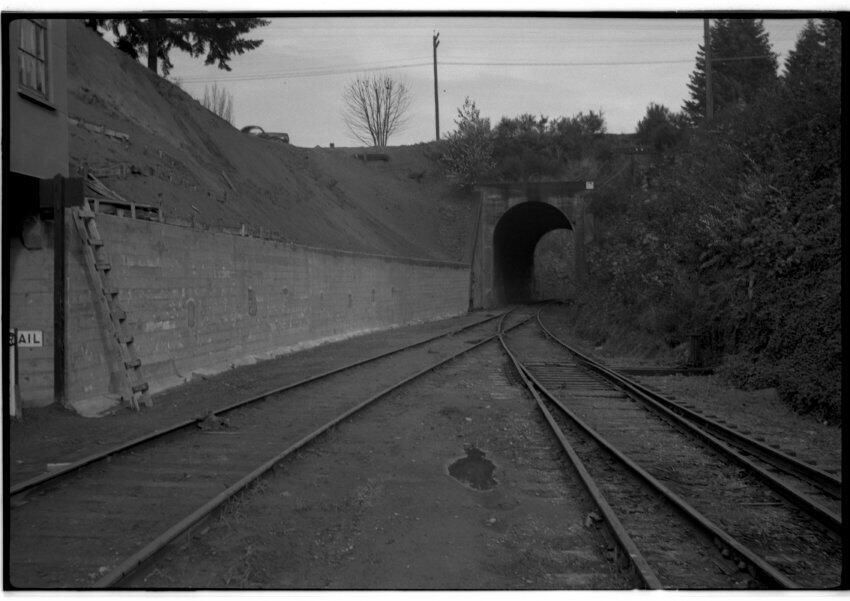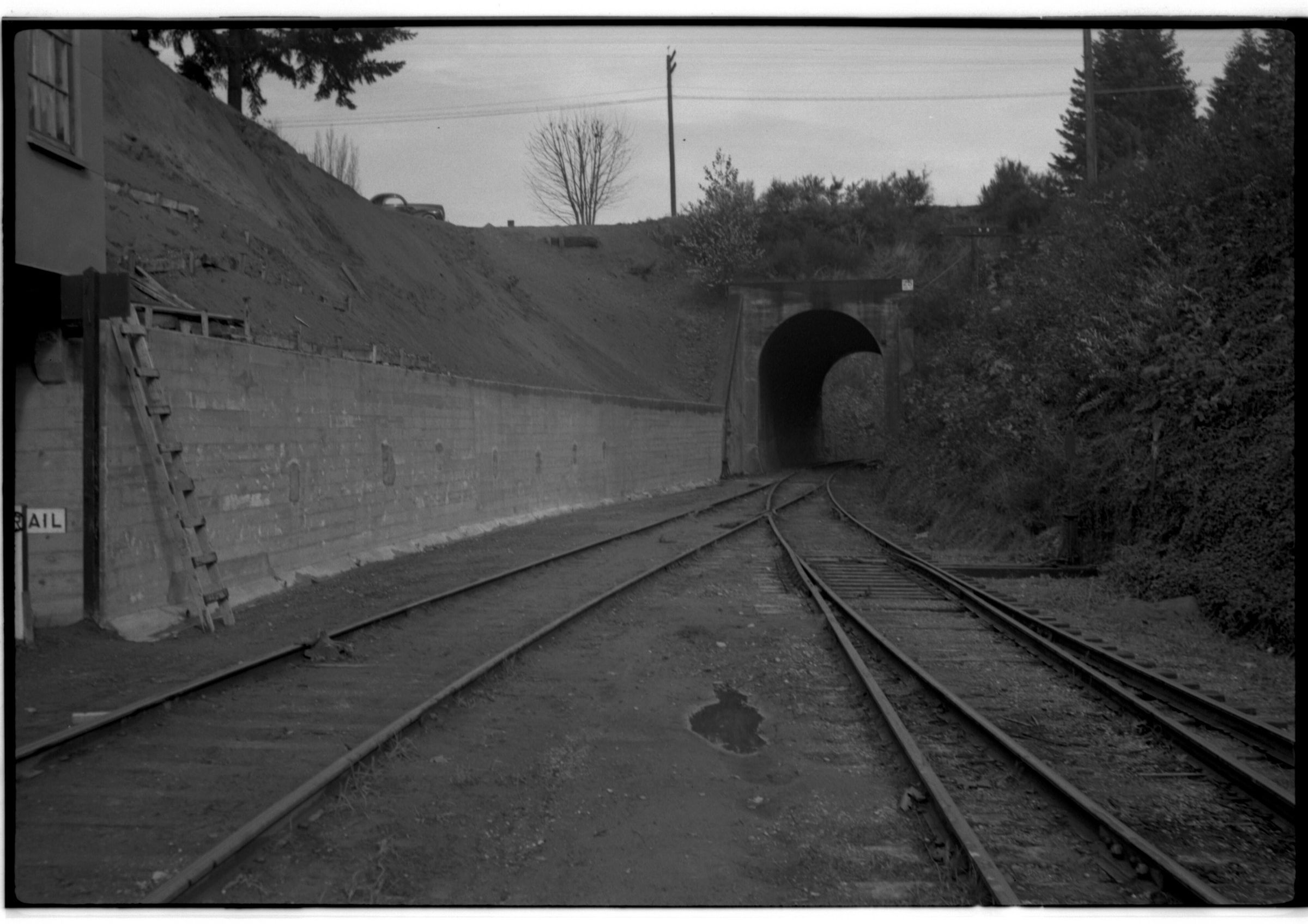 Negative, sheet film. 2.25 x 3.5 b&w. Rail line and tunnel along edge of Olympia brewery.