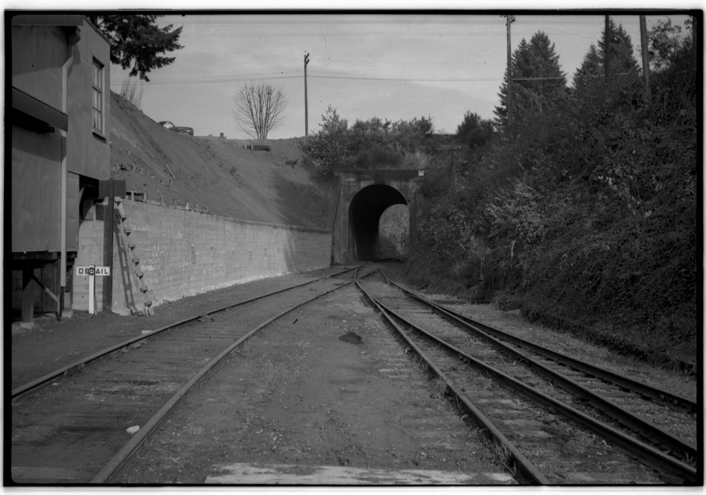 Negative, sheet film. 2.25 x 3.5 b&w. Rail line and tunnel along edge of Olympia brewery.