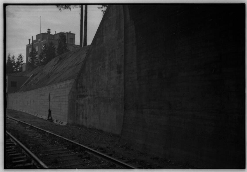 Negative, sheet film. 2.25 x 3.5 b&w. Rail line and tunnel along edge of Olympia brewery.