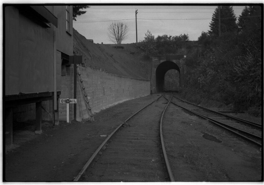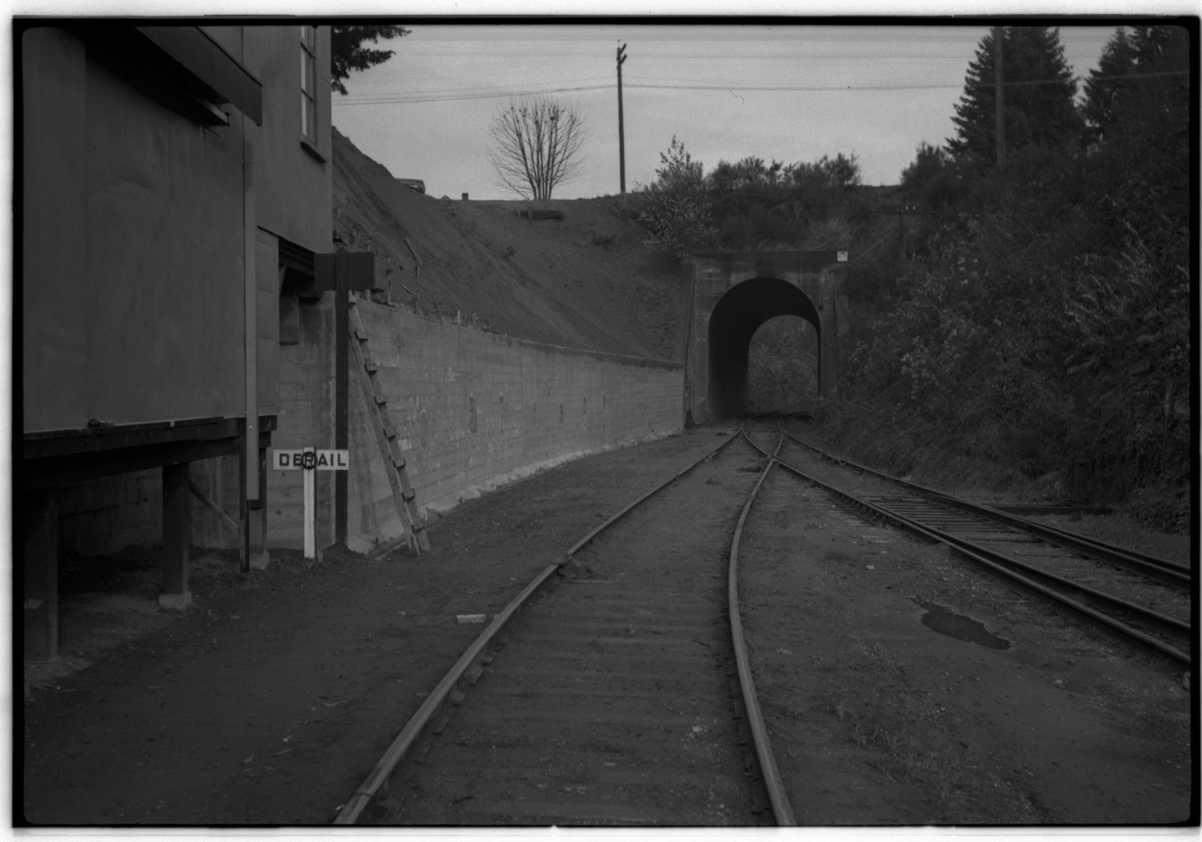 Negative, sheet film. 2.25 x 3.5 b&w. Rail line and tunnel along edge of Olympia brewery.