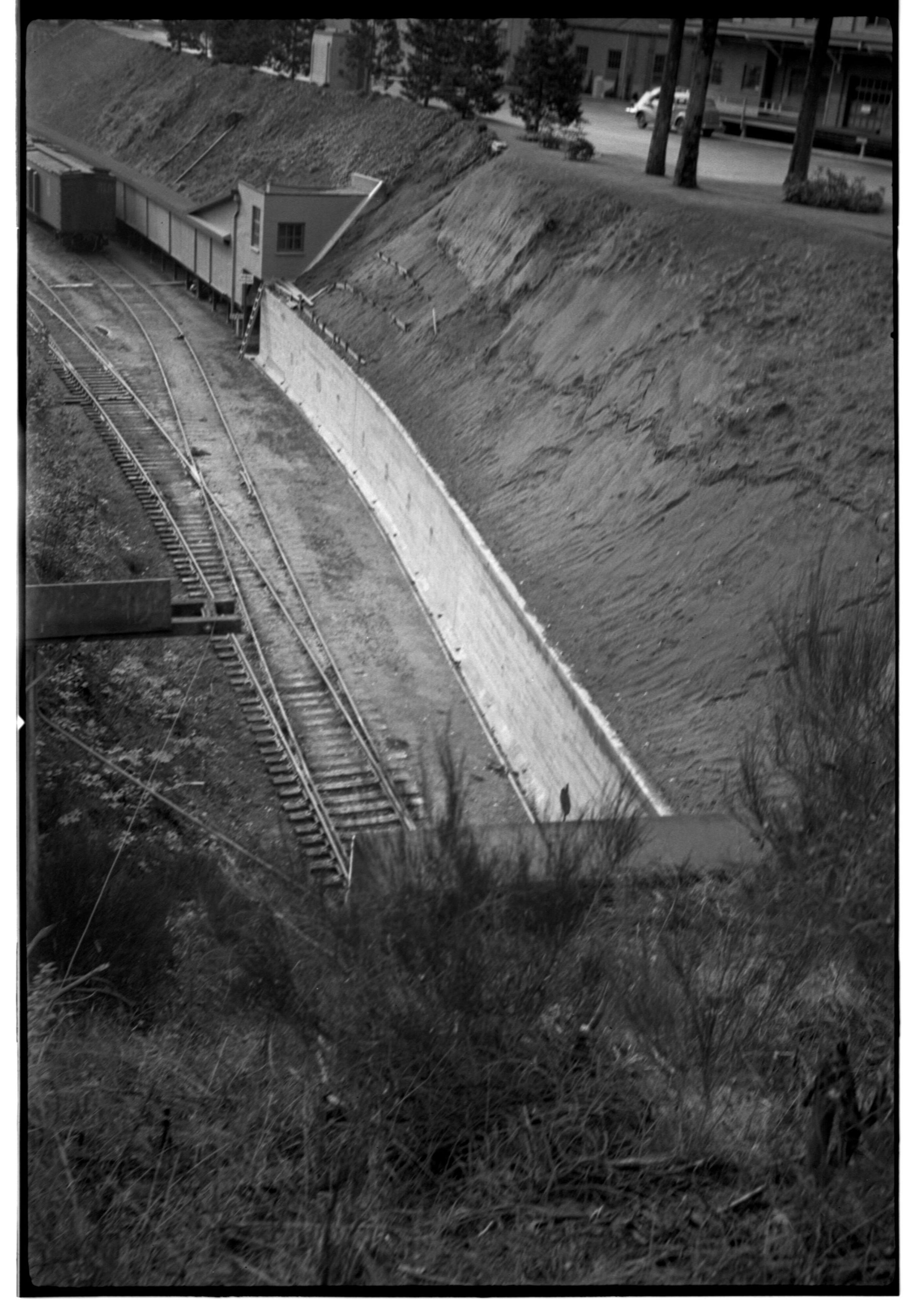 Negative, sheet film. 2.25 x 3.5 b&w. Rail line and tunnel along edge of Olympia brewery.