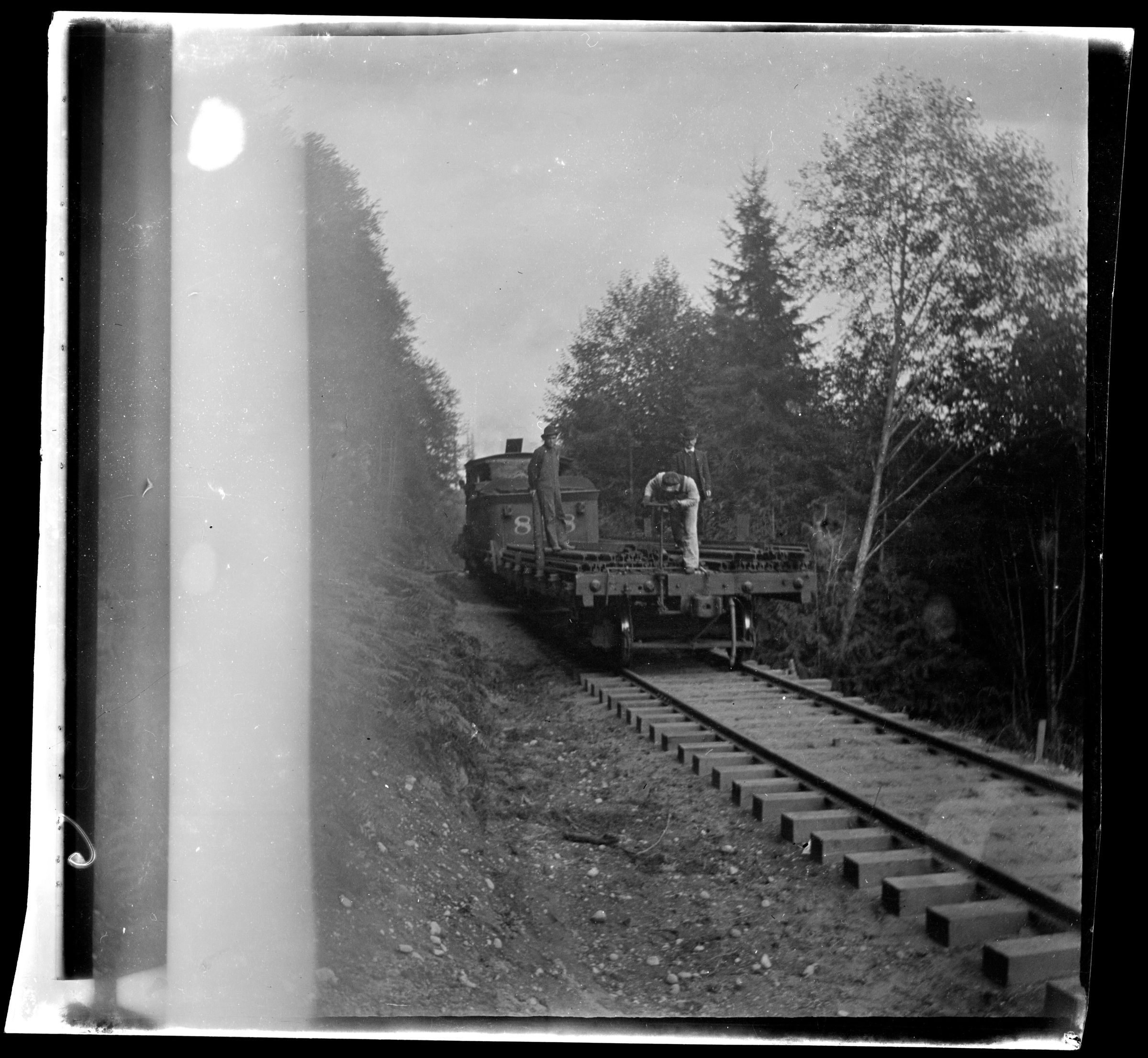 Negative, sheet film. 3.5 x 2.75 b&w. Train. Port Townsend Southern track in Tumwater. Photo shows engine, tender, and flat car.
